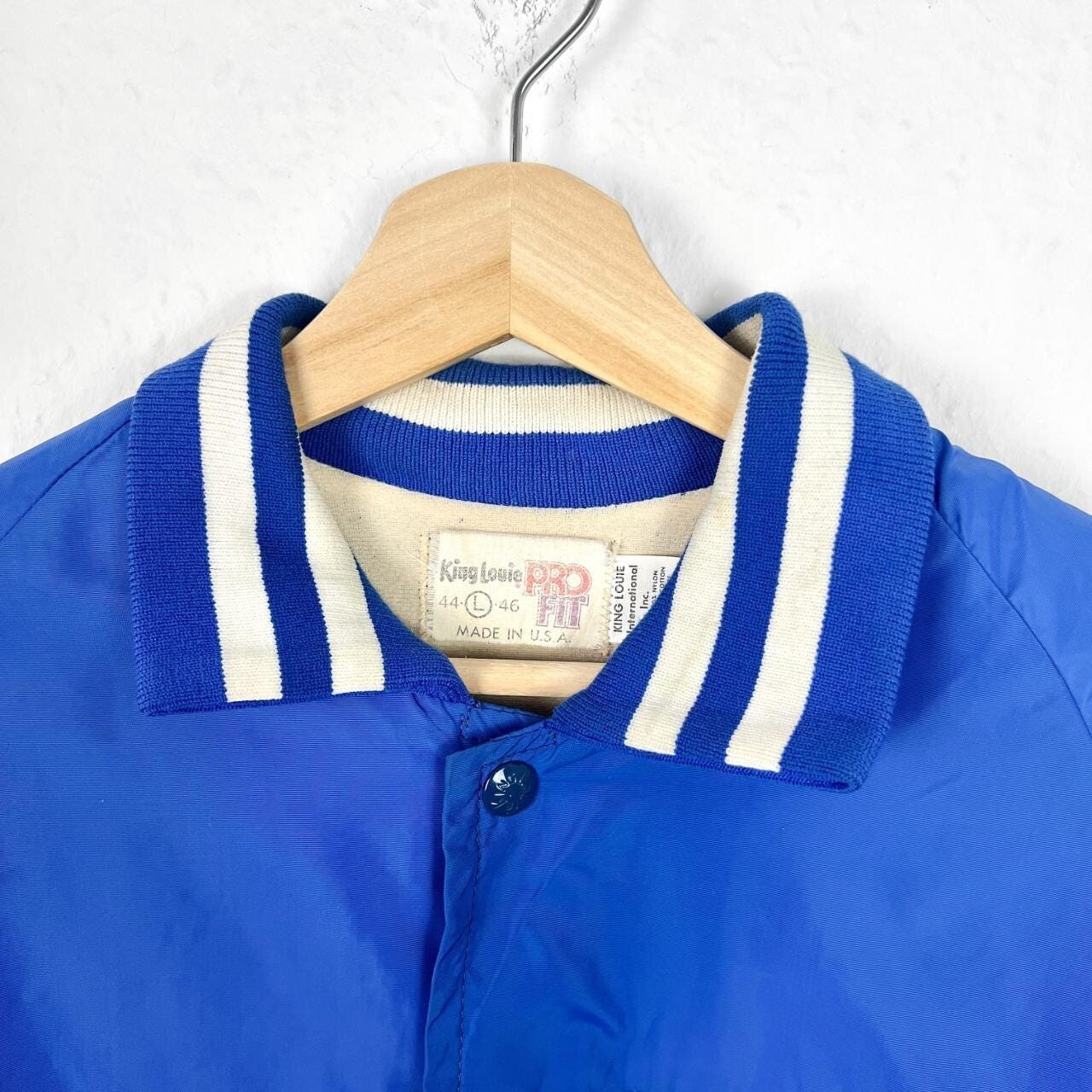 Vintage workwear satin bomber jacket in blue with embroidered McCord Gaskets business logo patch. Has full snap button up front, twin hip pockets plus striped collar, cuffs & waistband. Brand is King Louie, in good vintage condition with minor wear. Labelled size large - closer fits a modern day medium or suits smaller oversized, measurements below Length: 25 inches Pit to pit: 25 inches £3 UK P&P 💌 Model is 5’9 and a men’s medium Please get in touch for more measurements All items are second-hand so please expect small signs of wear - any major flaws will be noted