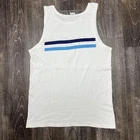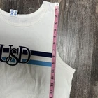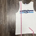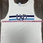 Vintage Champion Tank Top Shirt Mens Large White USD Blue Striped 70s USA Cotton Condition: Good vintage condition with light wear and some minor signs of age, including a tiny pinhole near the hem as shown in the photos. No major stains or tears. 100% cotton fabric, soft and comfortable Champion brand with iconic old-school blue/red tag Made in U.S.A. Features "USD" lettering in navy and light blue with double stripe graphic on both front and back Tag Size: Large (please see measurements for accurate fit) Flat measurements: Approximately 20" pit to pit, 29" length from shoulder to hem Shirt has single stitch hem typical of 70s-80s era Rare retro collegiate style, perfect for collectors or casual summer wear See photos for all details and close-ups of tags, graphics, and minor flaw