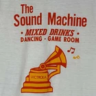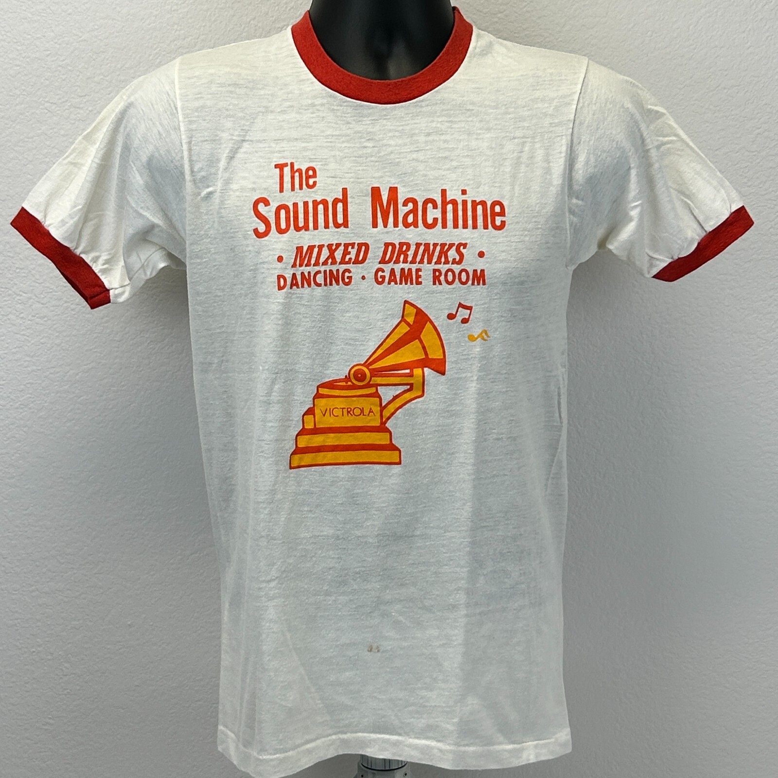Vintage 1970s 80s The Sound Machine Dance Bar Ringer T Shirt Huntsville Texas Disco Club Mixed Drinks Dancing Game Room Victrola Phonograph Single Stitch Graphic Tee I got this shirt with a lot of Houston Texas area shirts so I assume this is from the disco club with this name that was in Huntsville, Texas and was in the movie " Everybody Wants Some!!" Condition: Has a couple of spots and pilling. No other flaws noticed. Missing tag but I feel it measures similar to a Small. Check measurements to ensure fit. See photos. Size and Measurements: Mens/Unisex Small Width 17.5" - Underarm to underarm Length 26.5" - Measure from top of shoulder, at the edge of collar, to the bottom of the shirt