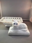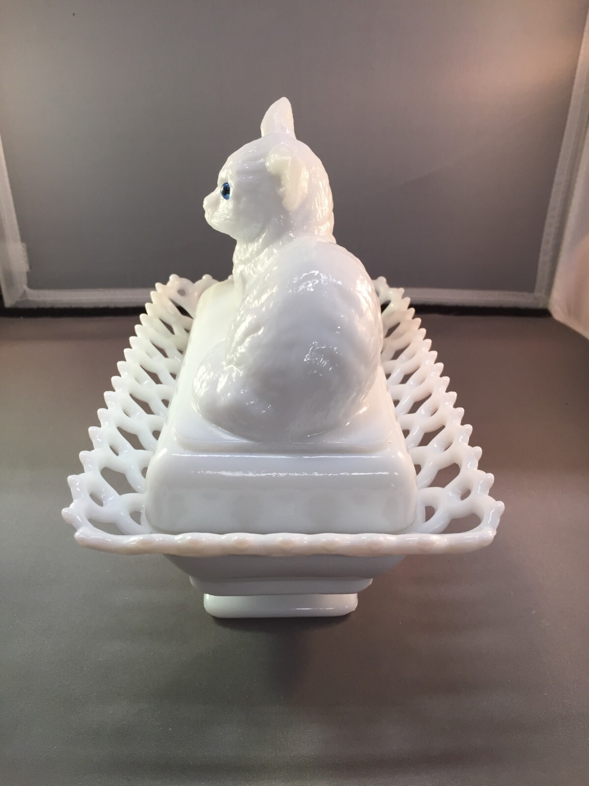 VINTAGE 8 INCH WESTMORELAND / ROSSO GLASS COMPANY CAT ON LACE BASKET -- SNOW WHITE GLASS. GLASS EYES. NICE VINTAGE CONDITION. NO CHIPS OR CRACKS CAT AND NEST MEASURES APPROXIMATELY 8 INCHES LONG, 5 INCHES WIDE AND 7 1/4 INCHES TALL. GREAT TO USE FOR TRINKETS, AS A CANDY DISH OR A SUPER ADDITION TO YOUR COLLECTION. FREE SHIPPING WITHIN THE CONTINENTAL UNITED STATES. I TRY TO DESCRIBE ALL ITEMS TO THE BEST OF MY ABILITY, AS ACCURATELY AND AS HONESTLY AS POSSIBLE, BUT IT IS IMPOSSIBLE TO BE AN EXPERT IN ALL REALMS OF COLLECTING. I MIGHT INADVERTENTLY OMIT INFORMATION WHICH YOU, AS A COLLECTOR FEEL IS IMPORTANT. I AM HAPPY TO ANSWER ANY QUESTIONS. PLEASE ASK THEM BEFORE BIDDING OR BUYING. Returns : I do not accept returns, however, if you feel I missed something in the description/pictures and you are not satisfied with your purchase, please contact me and I will be happy to work with you. I PACKAGE SAFE AND SECURE. I MAIL PROMPTLY. I CAN NOT BE RESPONSIBLE FOR ANY SITUATION CREATED BY THE USPS. PLEASE CHECK MY OTHER LISTINGS FOR MANY MORE GREAT COLLECTIBLES. THANK YOU AND HAPPY BIDDING.