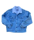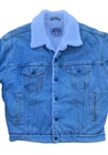 This Levi's Sherpa Jacket is a vintage piece from the 80s or 90s, featuring a light blue wash denim outer shell with a cozy sherpa lining made of cotton. The jacket is a size Large and designed in a classic trucker style, perfect for a retro look. It includes insulated polyester material for added warmth, along with functional pockets for convenience. This timeless piece embodies the 80s theme and is a stylish addition to any wardrobe for men looking for a classic, cool vibe. Measurements: Pit to pit length: 25” Top of collar to bottom length: 30” Top of shoulder of end of cuff length: 24” Shoulder to shoulder: 23”