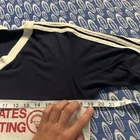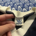 The product is a vintage 80s Adidas Trefoil Striped Ringer Single Stitch Shirt in size Large. This t-shirt features a striped pattern in a blue color, making it a stylish and nostalgic addition to any man's wardrobe. The adidas Trefoil product line adds a touch of sporty flair to this retro piece, perfect for those who appreciate both 80s style and quality brand design. Measurements: (19 x 24) - (Width x Length)