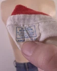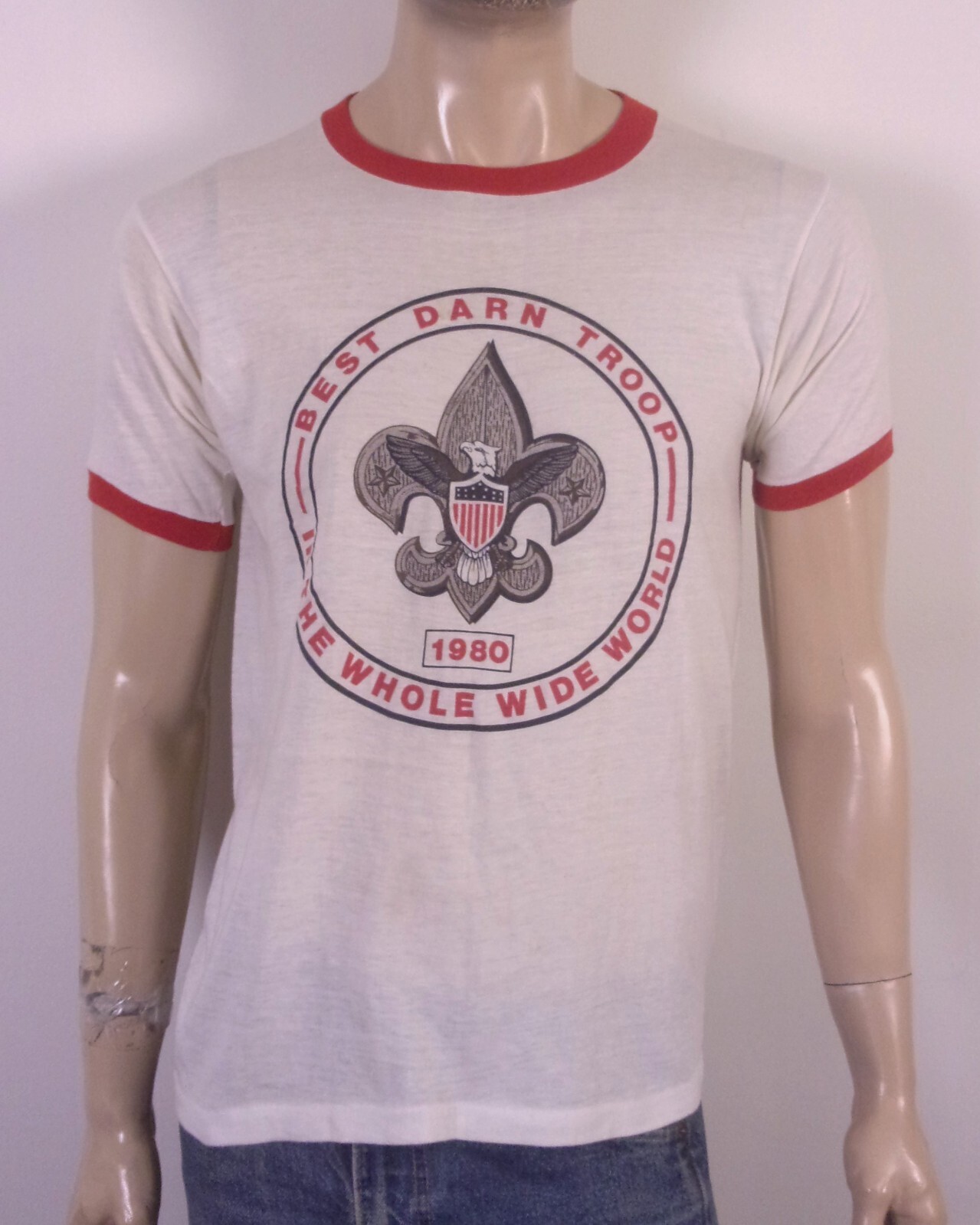 This vintage 80s T-shirt is a rare find featuring a graphic print of the Boy Scouts of America (BSA) logo. Made of a thin cotton blend fabric in white with a red ringer design. The T-shirt has short sleeves, a crew neck, and a regular fit in size L. It is machine washable and showcases single stitch detailing, embodying a 70s and 80s retro aesthetic. Looks awesome! True vintage single stitch, it has a few very, very tiny surface marks/flaws, but nothing individually really major, still really nice shape for being from 1980! Buttery soft and thin.