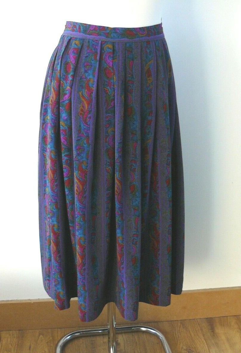 Good vintage condition no faults found. This skirt is hand made and has no fabric or other labels. Feels a bit like slub silk but is likely man made. Unusually the skirt fastens with a button and a popper no zips. Measures 15" across waist so will fit a modern UK 12. 30" long so a midi length. Soft pleats all the way round. Not lined or particularly well finished.