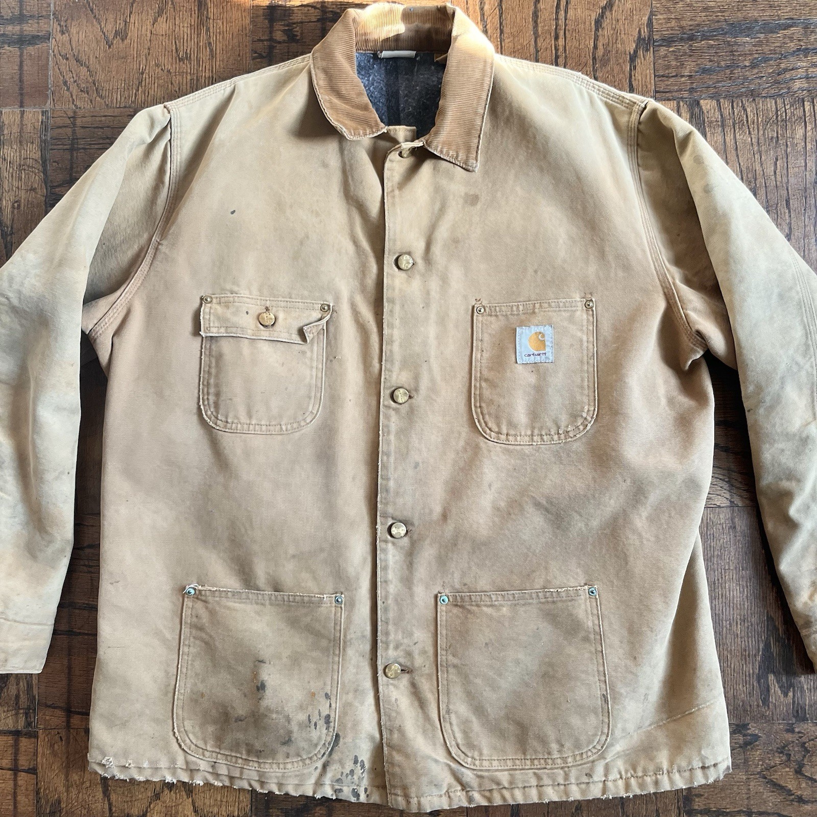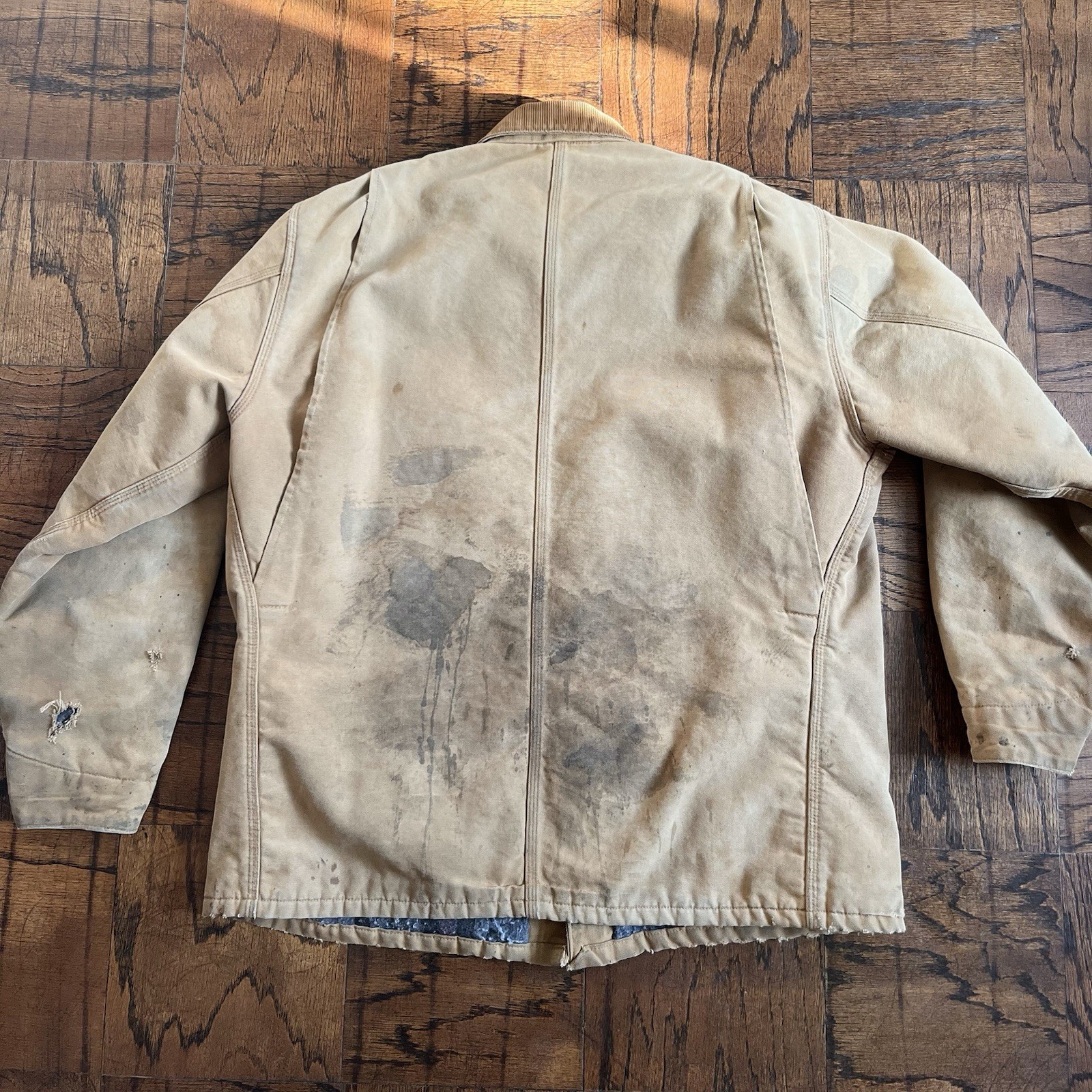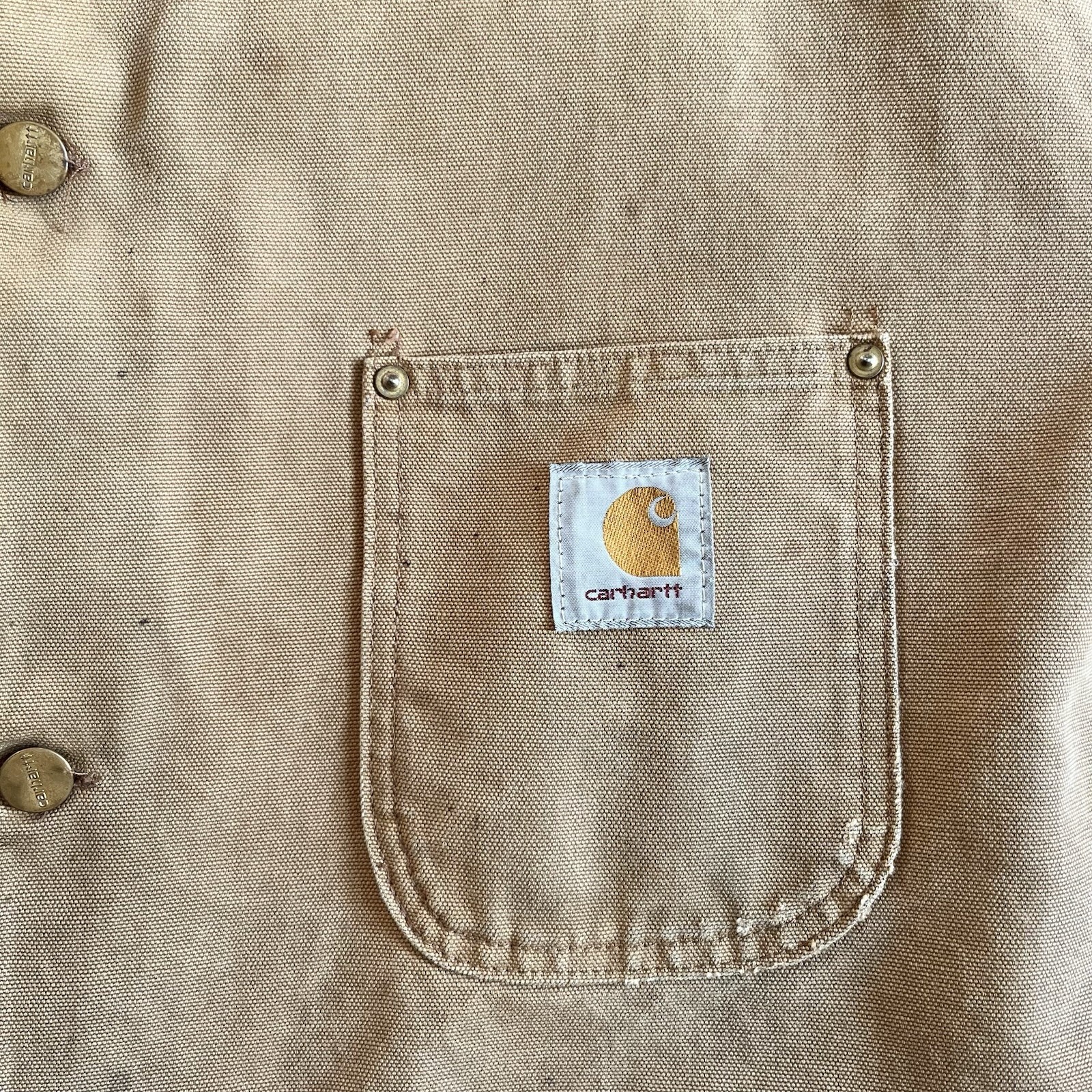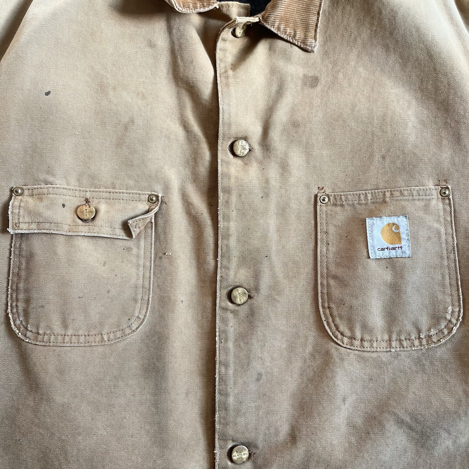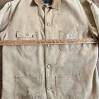 Vintage 80s Thrashed&Stained Carhartt Blanket Lined Chore Coat. Obvious wear/Stains as pictured. Fits like a 2XL,26 inches pit to pit, 29 1/2 inch length from top of shoulder to end of waist, 23 inch arm length. Thanks for shopping (: