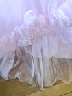 1980’s pink gown. Cotton candy organza and satin. The bodice has a heavily ruffled boat neckline. The ruffle edges are Iridescent. Matching flowers are tucked in the dense ruffles. Puff sleeves. The satin is lace adorned with bead and sequin flourishes. The full skirting is organza over tulle and satin. More ruffles and an organza flower with sash at the basque (v shaped) waist. Back zipper closure. No tags are present. This has some serious Glinda vibes. Or Disney princess, sugarplum fairy… oh the possibilities! Size 2XS/XS Approximate measurements are: Bust 30” Waist 24” Dress length from waist 42” Condition: Very Good. This piece was altered to fit a tiny figure. The seams under the arms have up to 2+” of fabric. The sleeves were not reattached under the arms after the bodice was taken in. There are small darts noted at the back waist area. The hem is edge is dingy bit not noticeable. There is an occasional very small spot. Please refer to the last 3 pictures **No returns are accepted **