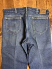 Vintage 80s Lee Riders Men 38X30 Jeans Blue Denim Starched Cowboy Union Made USA Waist: 38" Inseam: 30" Rise: 12" Please be aware that used, vintage, or older items may show a few signs or wear or slight fading due to age. Anything visible, such as stains, rips or holes are a possibility, if not shown initially. Measurements are taken from the waist, the inseam of the pant leg and the rise from the top of the jean to the end of the crotch.