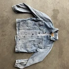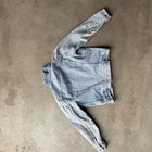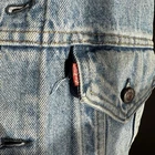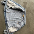 This is a vintage Levi's denim trucker jacket from the 80s with slight stains and distressing. Made of cotton denim in a classic blue color, featuring a button closure, collared style, and pockets. The jacket has a retro USA, 70s, and 80s theme with a logo accent. Suitable for casual, workwear, or travel occasions, it offers a regular fit for men and is perfect for various activities like riding, walking, or skateboarding. Could not determine size from tag but fits like mens Small to Medium.