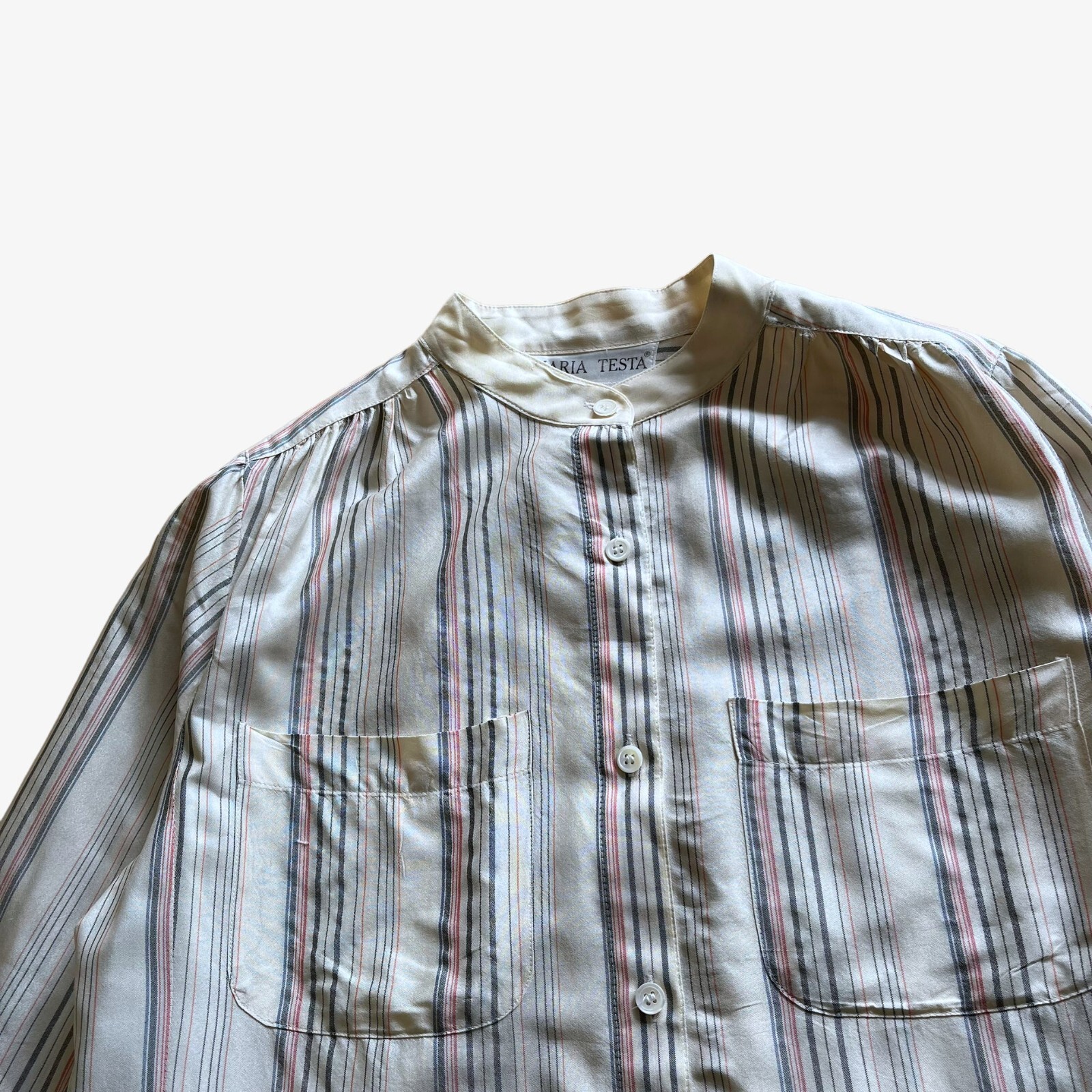 £20 On Casspio’s Dream Vintage Vintage 80s Women's Maria Testa Striped Long Sleeve Silk Blouse. Retro 100% Silk Two Side Pockets Two Breast Pockets Size Label: No Size Label Our Size: M / L Measurements: Pit to pit: 20 inches Nape of neck to hem: 29 inches Condition: Good. Signs Of Wear Around The Item.