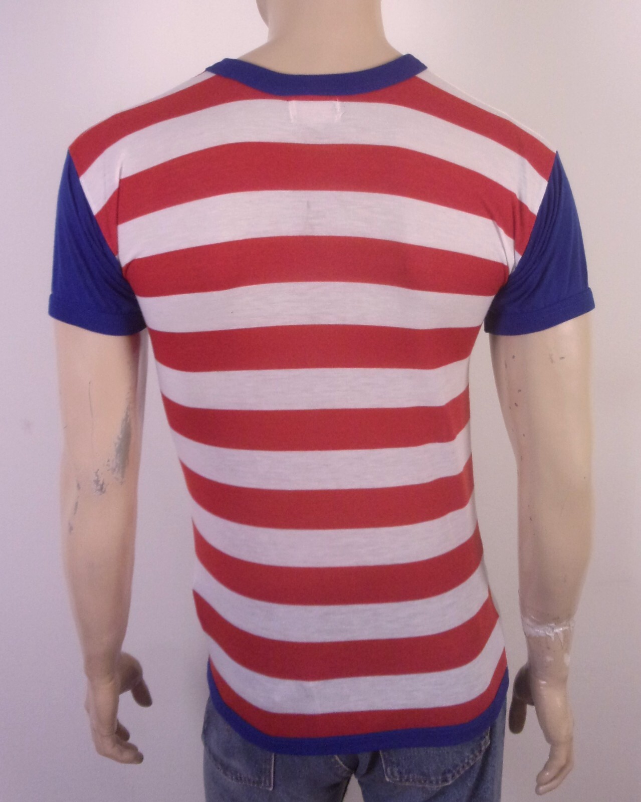 This vintage Coca Cola Coke T-Shirt from the 80s features a busy, colorful, and striped design with a ringer style. Made of a soft and thin cotton blend material, it has a crew neck and short sleeves. The shirt is a size small and fits like a regular t-shirt, suitable for both kids and adults. It has the Coca Cola logo accent and is machine washable. Looks amazing! This is tagged a youth size intended as a sleep/pajama style shirt, but see pics - this is on an adult size medium men's mannequin, and it fits amazing, just right! Fits an adult on the larger end of men's small to a smaller men's medium. Great shape throughout, crazy loud and very attractive!