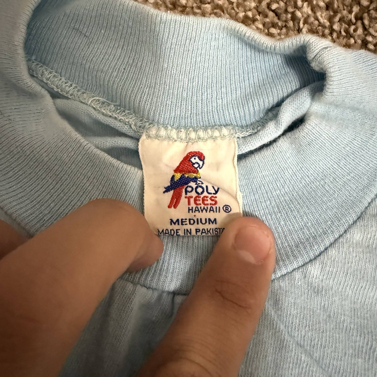 This Vintage 80s San Francisco Poly Tees shirt is a classic piece of men's clothing, ideal for those who appreciate retro fashion. Made of cotton material and featuring a crew neckline and short sleeves, this single stitch graphic tee comes in a vibrant blue color. With a regular fit, this shirt is perfect for the summer and spring seasons, and its vintage design gives it a unique appeal. Whether you're looking to add a touch of nostalgia to your wardrobe or simply want a stylish and comfortable T-shirt, this vintage piece is sure to make a statement. small stain in last picture.