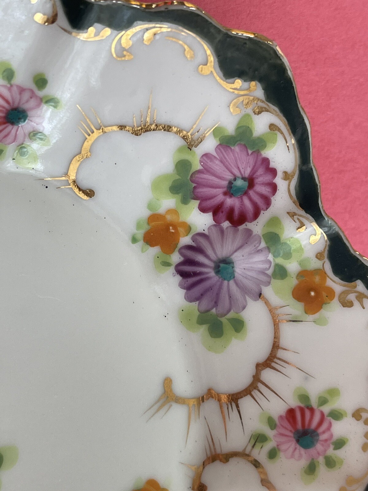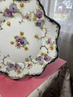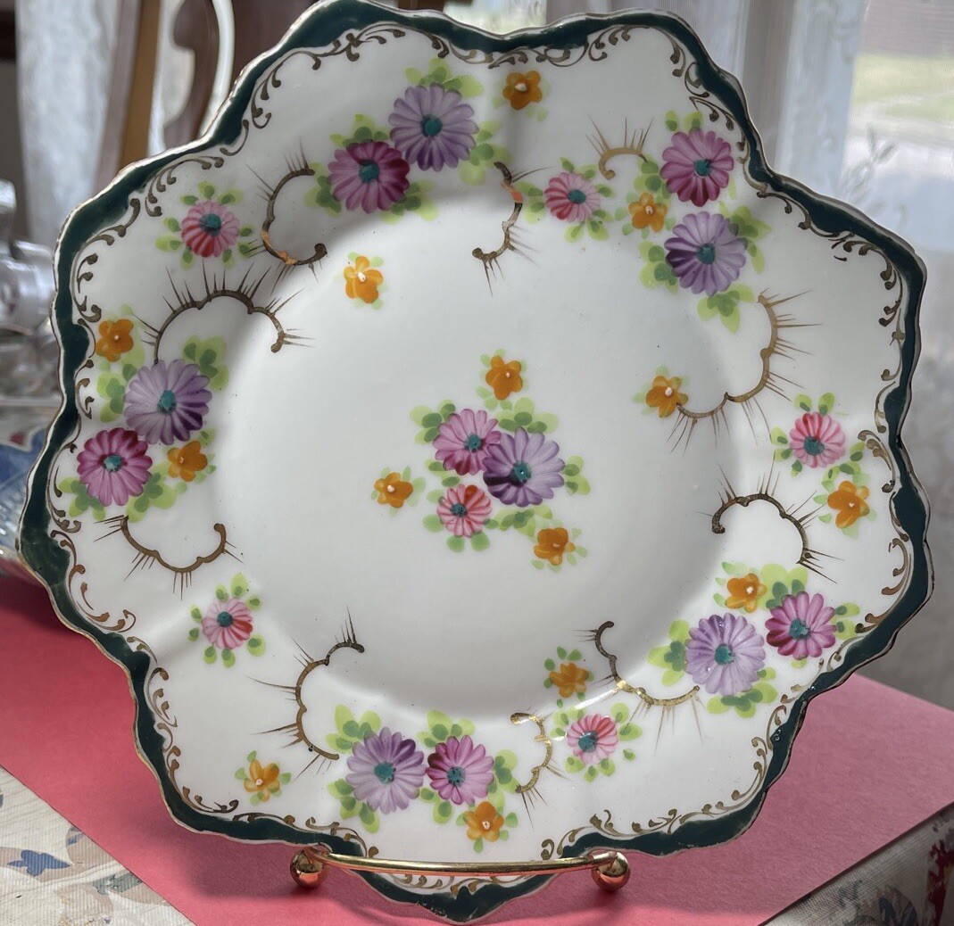 Vintage 8 inch Hand Painted Plate Unsigned Limoges Dresden? Florals Gilt. Only 1 small 5 mm chip on back as pictured. I have take a picture of the front and edge picture of the front scallop, quite insignificant and does not show from the front. Still bright white in color and the hand painting is precise. Beautiful pink, purple daisies or cone flowers, the gold paint gilding is intact, only a little fading on the edges. Estate sale find. Beautiful antique plate and wonderful condition. Thank you!