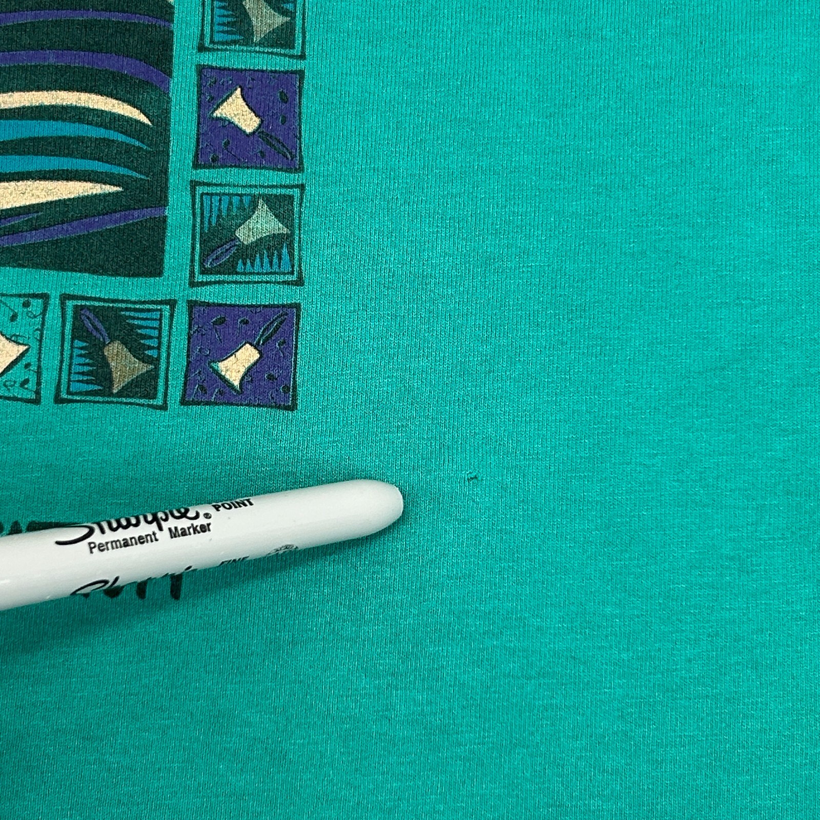 This vintage 90s handbell musicians tee is a nostalgic gem! The retro green color and classic Fruit of the Loom single stitch make it a cool collector's piece. While it shows some wear with minor cracking and patched pinholes, the character adds to its charm. Fits true to size with a comfortable relaxed cut. Perfect for handbell enthusiasts or anyone who loves unique vintage band tees!