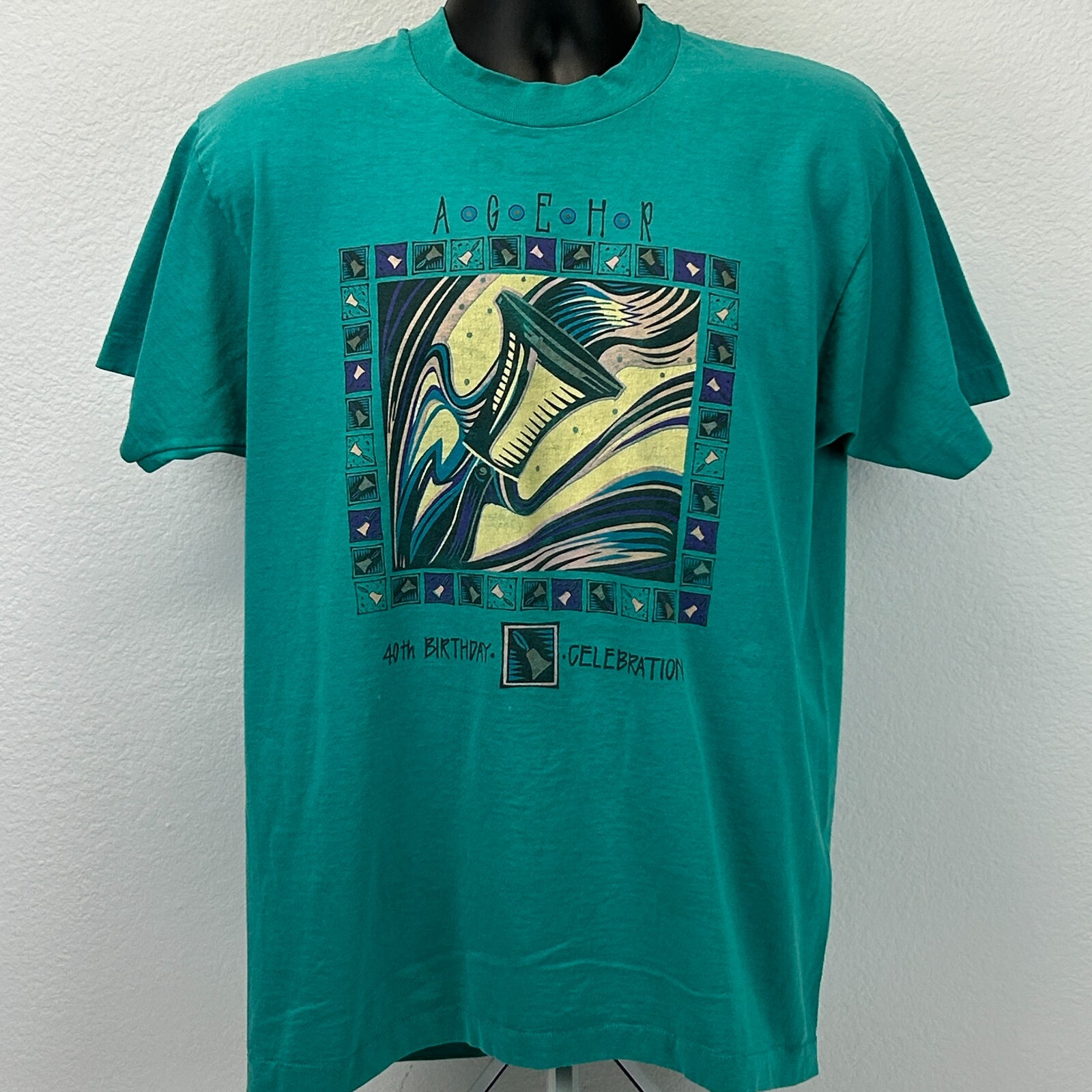 Vintage 90s AGEHR T Shirt Mens L Large Handbell Musicians of America American Guild of English Handbell Ringers Fruit of the Loom Green Single Stitch Made In USA Graphic Tee CONDITION: Has some spots, image cracking, and a few tiny pinholes have been patched from the inside. The holes should not spread further and skin will not show through. No other flaws noticed. See photos. SIZE AND MEASUREMENTS: Mens/Unisex L Large Width 21" - Underarm to underarm Length 28.5" - Measure from top of shoulder at the edge of collar to the bottom of the shirt