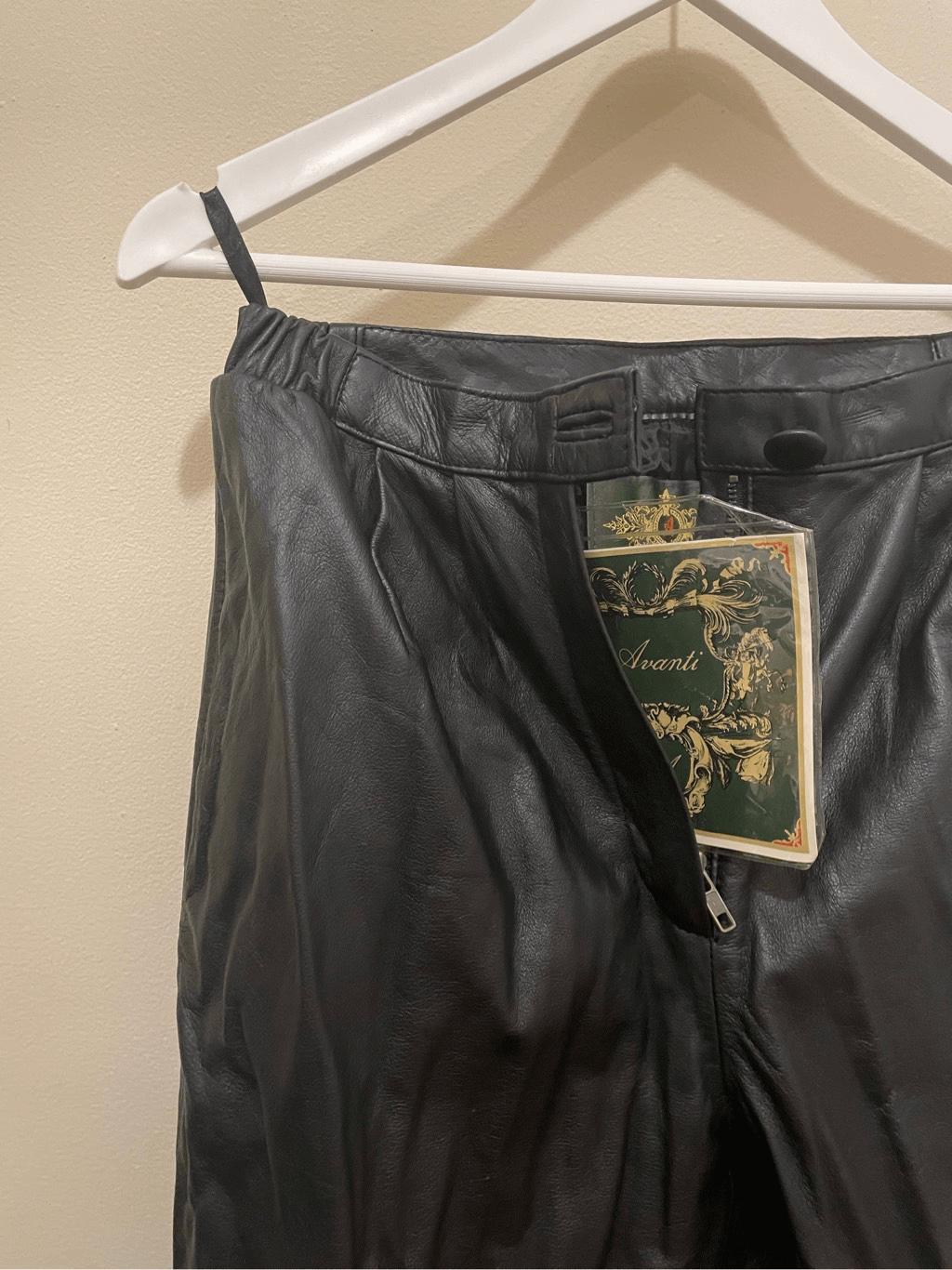 Has two pockets. Stretch elastic band at the waist Genuine leather
