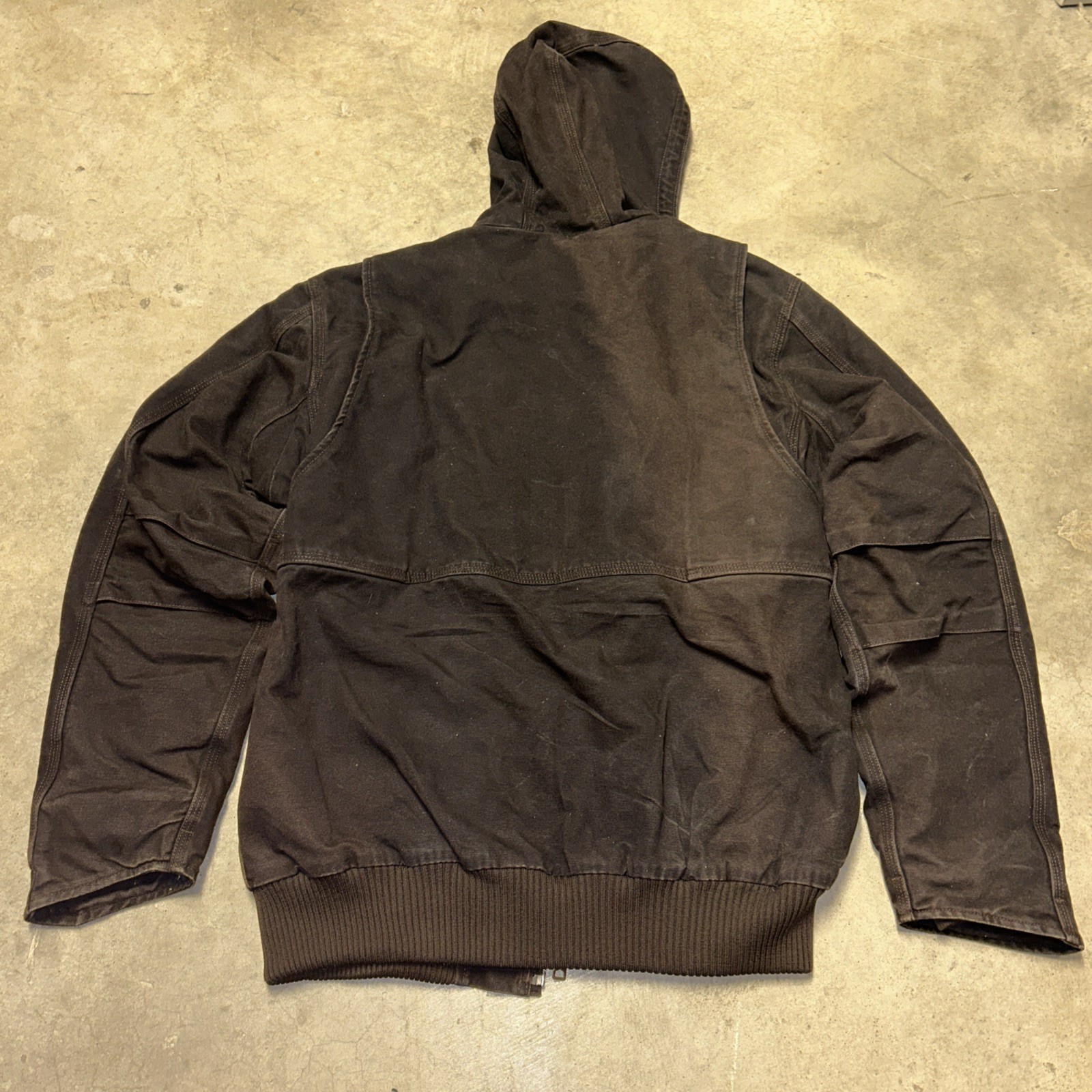 The Vintage 90s Brown Faded Men’s Carhartt Jacket is a stylish and functional piece made from durable cotton canvas with a polyester lining for warmth. This bomber jacket features a spread collar, zipper closure, and multiple pockets including zipped pockets and a hood for added convenience. The jacket is insulated and wind-resistant, making it suitable for winter, fall, and spring seasons. With its vintage 90s theme and solid brown color, this Carhartt jacket is perfect for casual or workwear occasions, offering a classic look with a touch of nostalgia. Perfect for all wardrobes fits well with a vintage wardrobe, great pickup for you!!!