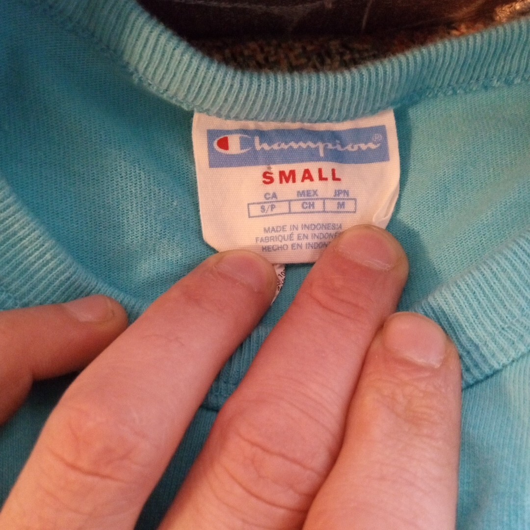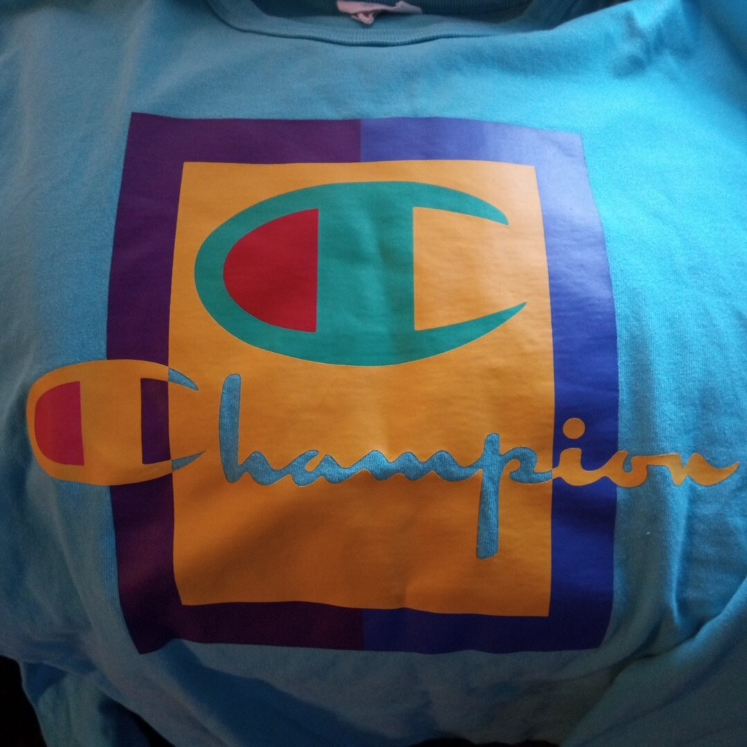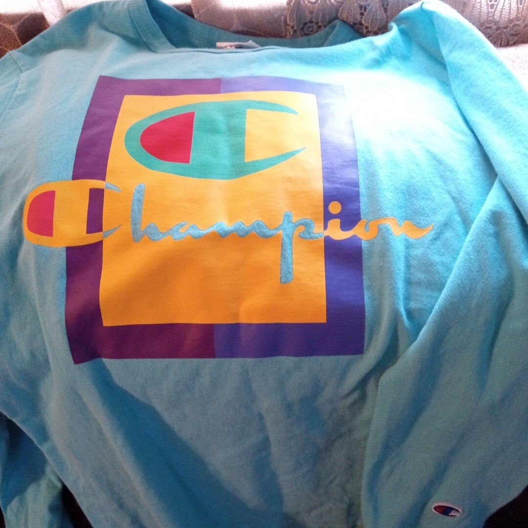 This Champion T-Shirt features a colorful 90s style design in cyan, Carolina teal, and blue hues. It is a long-sleeve shirt with a crew neck, crafted from cotton material and has a regular fit in size small. The garment is machine washable, making it easy to care for and ideal for the fall and spring seasons. Perfect for men looking for a classic and vibrant addition to their casual wardrobe.