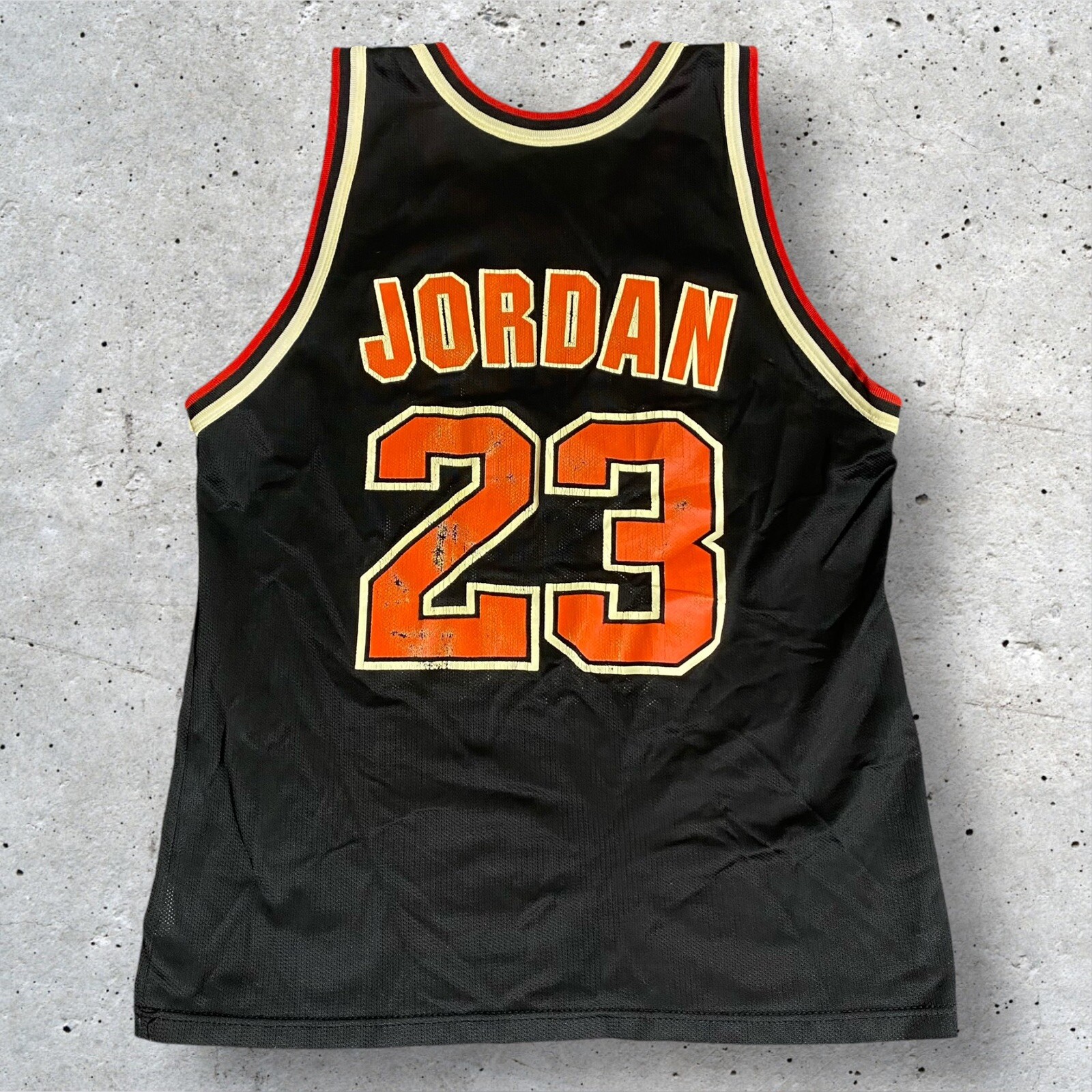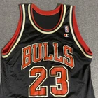 Rare Vintage Champion 90s Made in USA Chicago Bulls Michael Jordan Jersey Adult Men’s Size 44 Large. Good used condition. Has obvious signs of wear and fade. Yellowing on the white on sleeves and numbers. Has some cracking and the neck tag has been removed. All flaws shown in photos. Besides yellowing, no major stains, no rips, holes, tears, or major damage. Measurements in photos and description! MEASUREMENTS Pit to pit: 21 inches Length: 29.5 inches Shown in photos! ** This item has been washed and cleaned per eBay’s used clothing policy. ** Ships within 24 hours of purchase via USPS Ground Advantage.