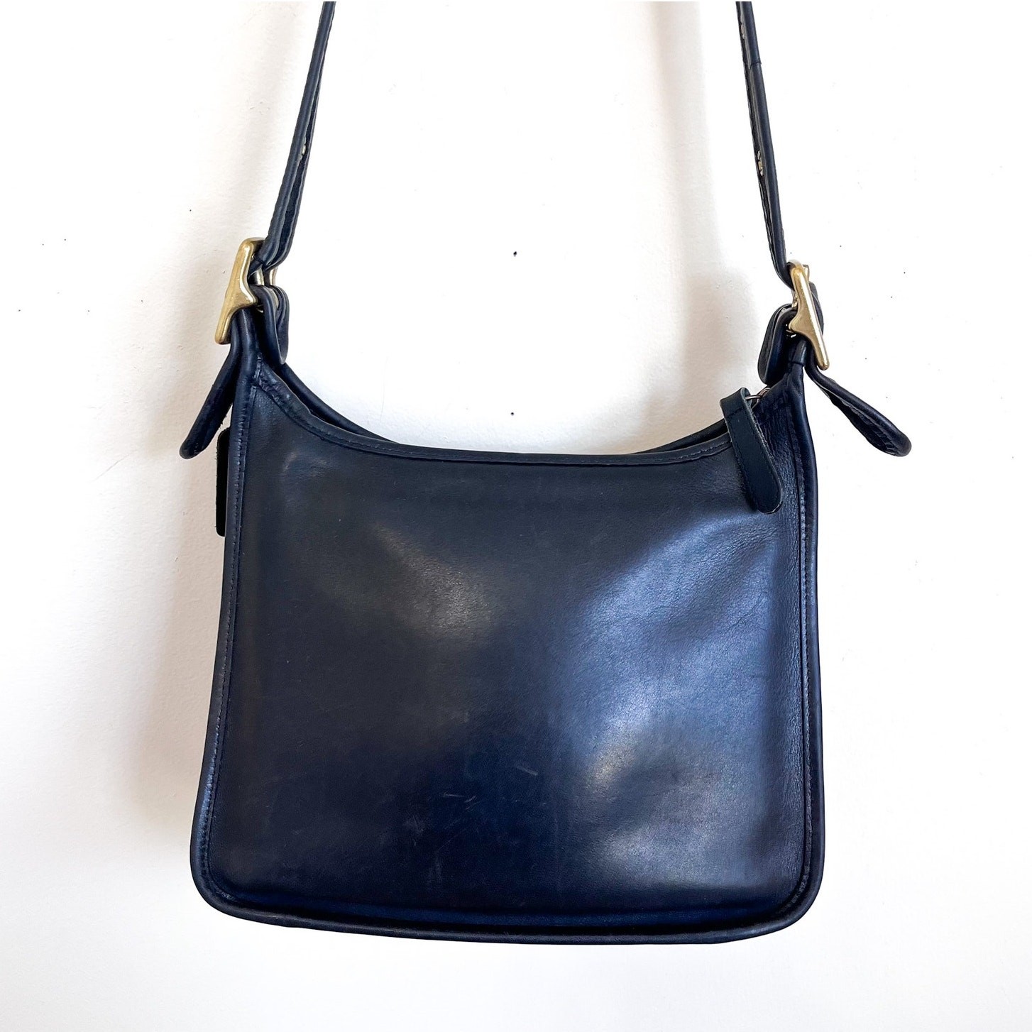Black Leather VTG Coach Legacy Handbag Purse Crossbody Shoulder Bag Top zip closure Adjustable buckle shoulder strap Brass goldtone hardware Interior zip pocket and slip pockes Exterior slip pocket Logo hang tag Made in USA Sz 10.5 X 9.5 X 4 Good condition with light distressing from normal wear, pls see all pics