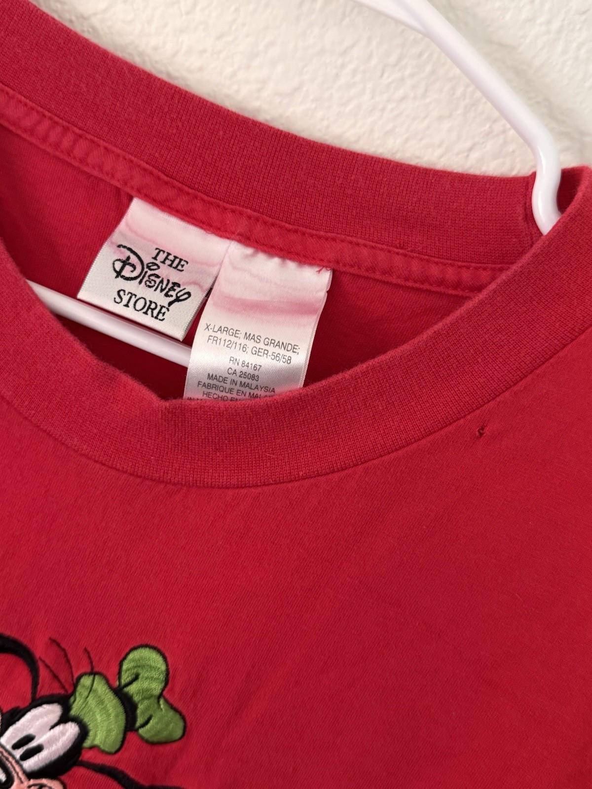 Vintage 90s Disney Store embroidered Goofy tee in bright red. Features a large high-quality stitched Goofy graphic with embroidered “Goofy” text below. Made in Malaysia, authentic Disney Store tag (RN 84167). Super soft cotton with a vibrant color and retro Y2K fit. Great piece for Disney fans, collectors, or vintage streetwear lovers. Embroidery clean and intact — one minor hole (pictured)