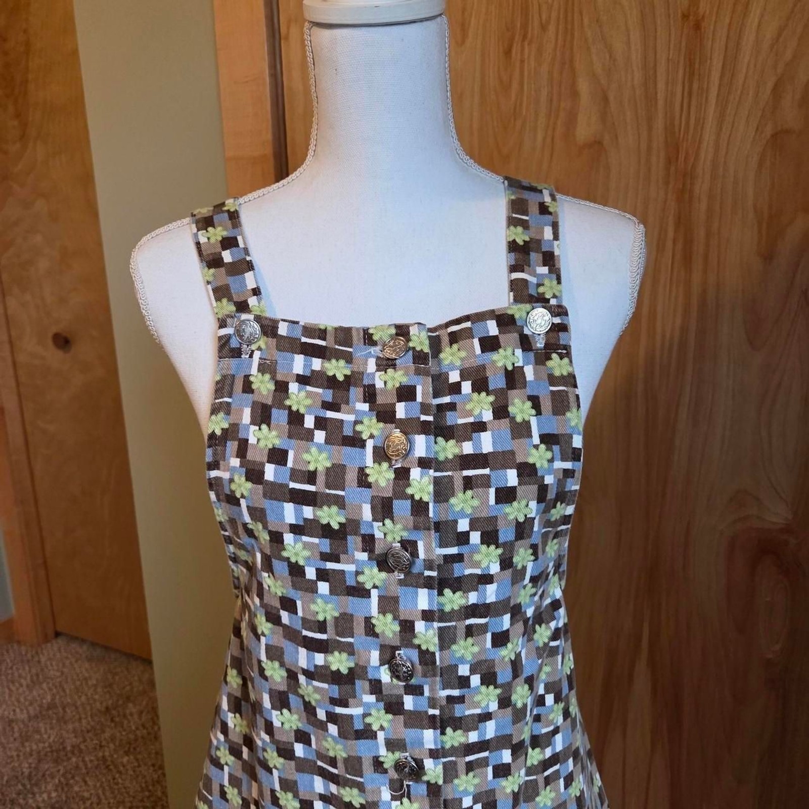Vintage 90s Floral overall mini Dress Stylish sleeveless dress with a multicolor geometric pattern. Perfect for casual outings. Overall mini dress style Vintage 90s A. Byer Size 9, fits like a small totally kidcore, floral girl, femme, unique, geometric