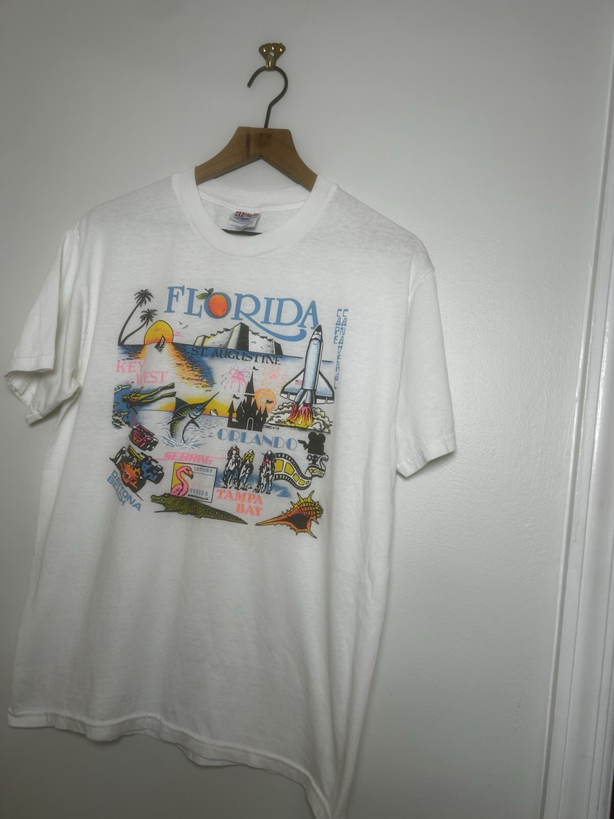 Vintage 90s Florida State Destination Graphic T-shirt Medium White VTG Cotton Good Preloved Condition No Major Flaws Tagged Medium Measures 20 in pit to pit 27 in length 50/50 Cotton Polyester Blend This vintage 90s t-shirt features a Florida State destination graphic print on the front. Made of white cotton, it has a crew neck and short sleeves, with a regular fit in size M. It is machine washable and was manufactured in the 1990s. The brand is Hanes, and it has a 90s theme. This authentic vintage piece is from Mexico and suitable for all seasons.