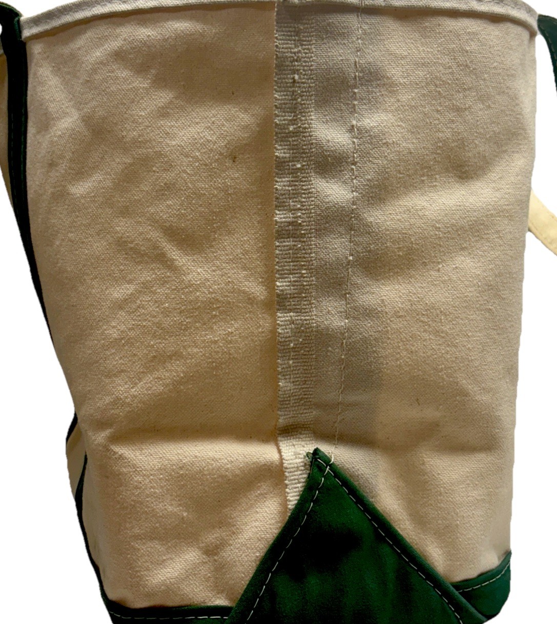 The Vintage 90s LL Bean Boat & Tote Bag is a classic and durable shopping tote made of white and green canvas, with a sportswear/beach look typical of the 1990s. This original adult unisex bag was crafted in Maine, USA, showcasing the high-quality craftsmanship and Americana style that LL Bean is known for. Perfect for casual occasions, this XL tote offers both style and functionality for everyday use. Preowned condition. Please note: There are a couple of minor exterior stains; see photos