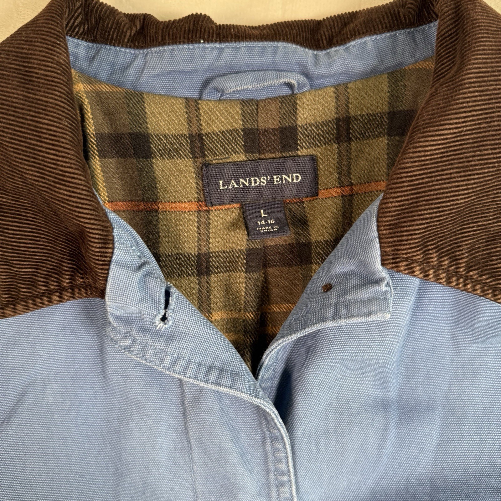 Lands End Chore Barn Coat Women’s Large 15/16 Blue with brown corduroy collar and cuffs Brown Flannel liner Very good vintage condition, has a couple of tiny stains, one by collar and one on sleeve, see photos Fast and secure shipping