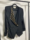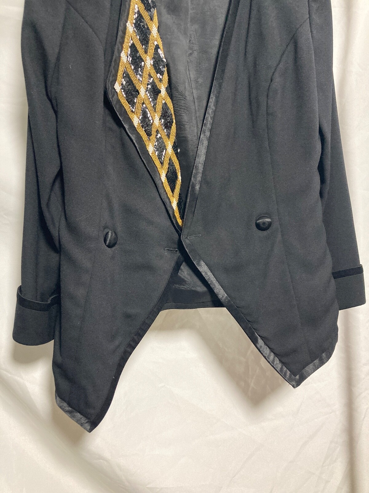 This stunning vintage blazer instantly elevates any look with its eye-catching beaded harlequin lapel and polished 90s glamour. The structured fit with subtle shoulder pads gives a powerful silhouette that's perfect for special occasions or adding retro flair to modern outfits. The rich detailing and unique design make this jacket a true conversation starter at parties, dinners, or formal events - a fabulous way to channel vintage sophistication.
