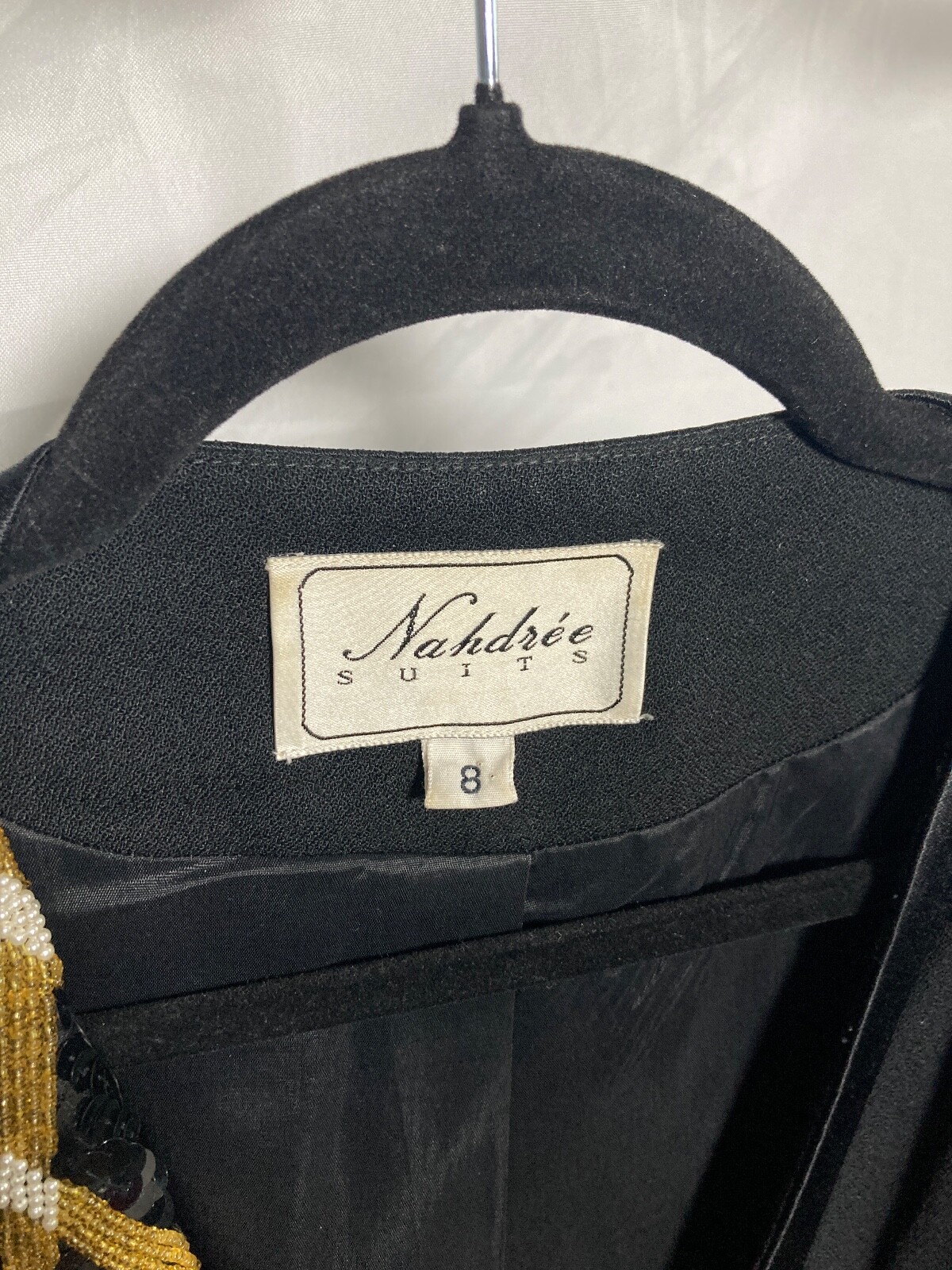 Make a bold statement with this vintage 90s Nahdree Suits women’s blazer in size 8. Featuring a striking harlequin beaded lapel and structured silhouette, this glam evening jacket is perfect for parties, formal events, or standout vintage style. Measurements (Taken Flat/In inches) Pit to pit: 18 Front Length: 28 Back Length: 23.5 Details: Size: Women’s 8 Harlequin beaded lapel Structured fit with shoulder pads Ideal for evening, cocktail, or glam looks True 90s vintage fashion Dry clean only.