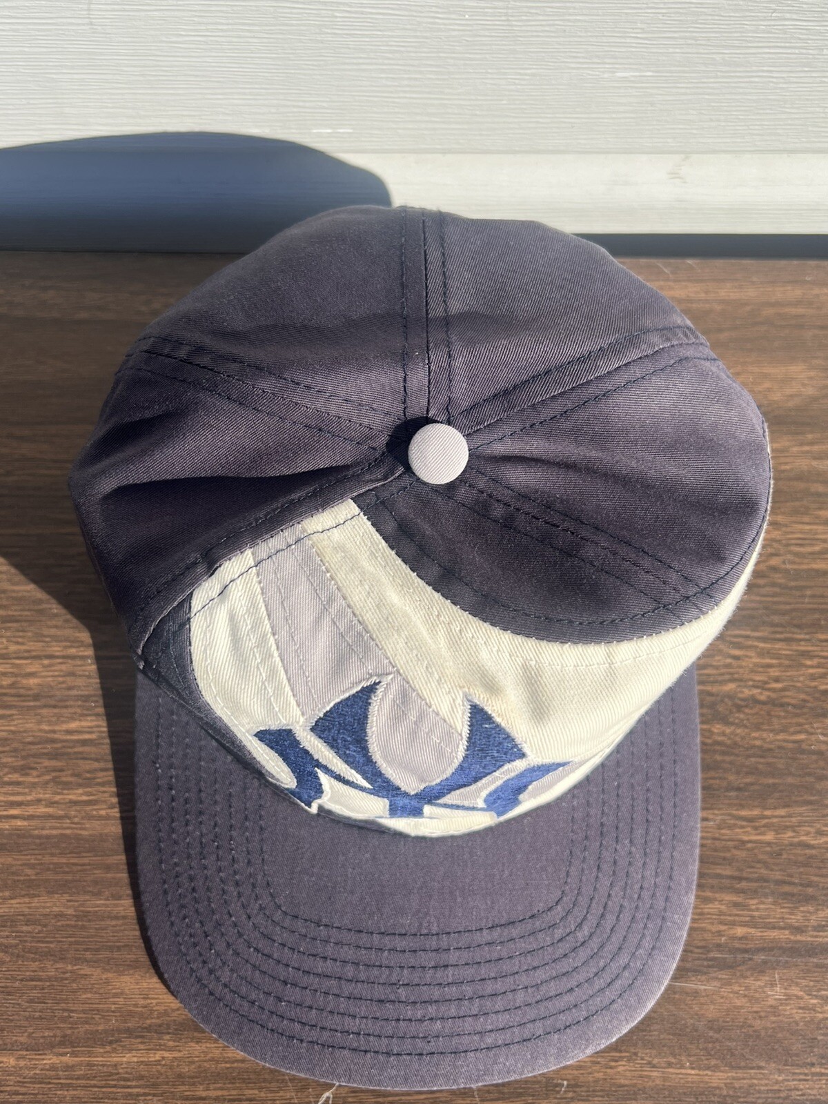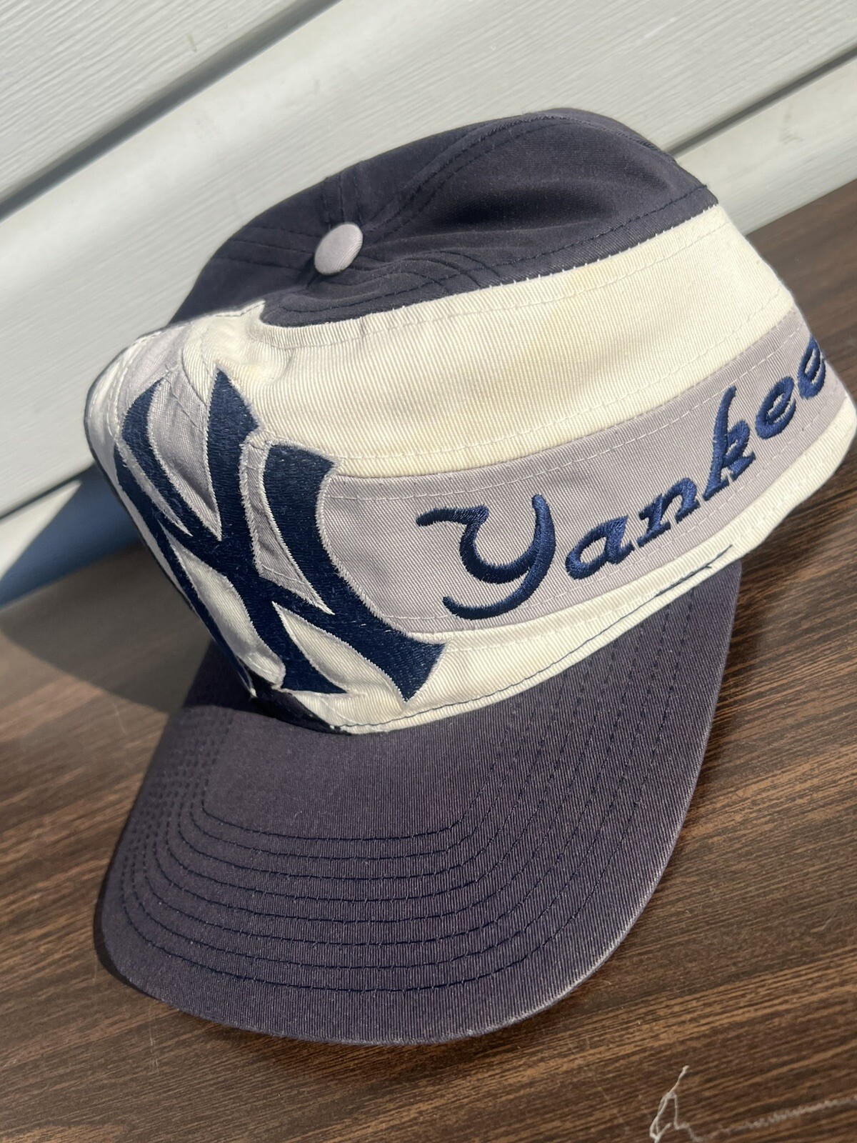 The product is a vintage 90s New York Yankees cap in gray color with blue and white accents, featuring the Antigua brand. It is a one-size-fits-all hat perfect for Major League Baseball fans.