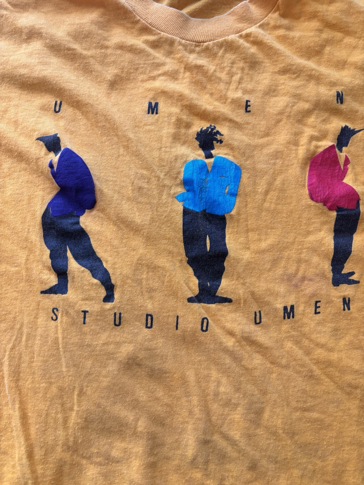 DESCRIPTION: Umen was a sub brand under the outlet Oaktree back in the 80s/90s, until they went out of business at some point in the mid 90s. Very much an epitomized example of early 90s streetwear, this shirt is stylish, single stitch, intentionally a bit short and very comfortable! CONDITION: GOOD Has a bit of wear and stretch but nothing too crazy. Other defects include a few pin sized holes near right shoulder, and a faded care tag. Graphic print is in great shape, and otherwise shirt is fully intact and in great shape! SIZING: XL* ESTIMATED So the tag simply reads as “BIG” under the size; shirt measures like a short XL. Pit to pit: 23” Shoulder to shoulder: 22” Neckline to hem: 24”