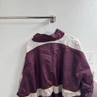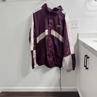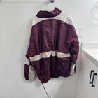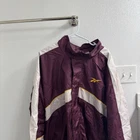 This vintage Reebok Windbreaker Jacket in maroon is a nostalgic 90s piece for men in size 3XL. Made of nylon, it features a full zip closure with white accents and a regular fit. The jacket is machine washable and suitable for all seasons, making it a versatile choice for casual occasions. The classic Reebok branding adds to its retro appeal, perfect for those looking to add a touch of 90s style to their wardrobe.