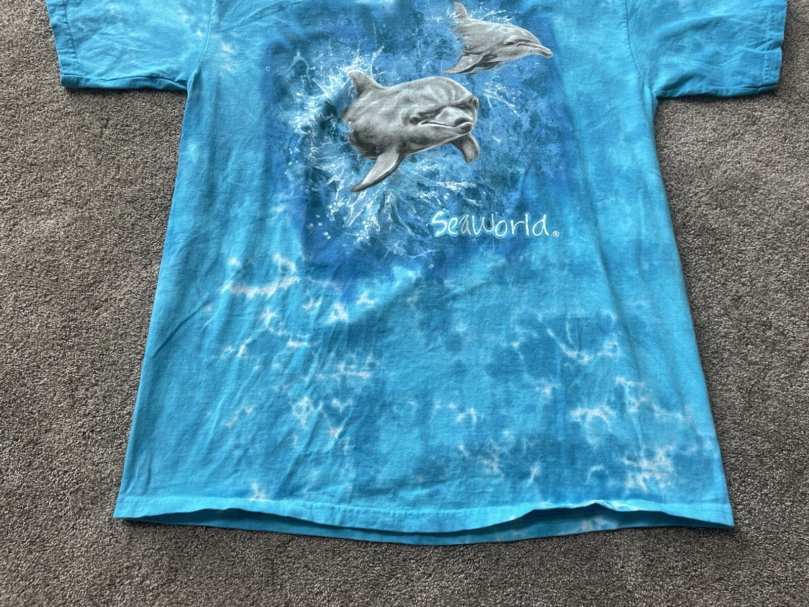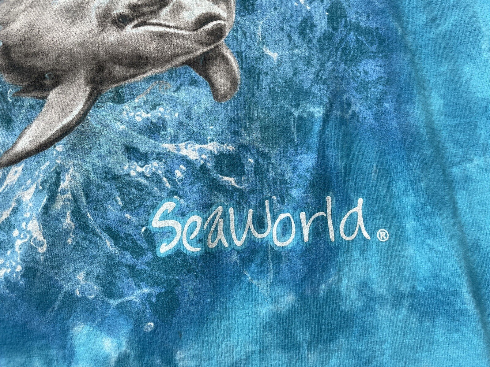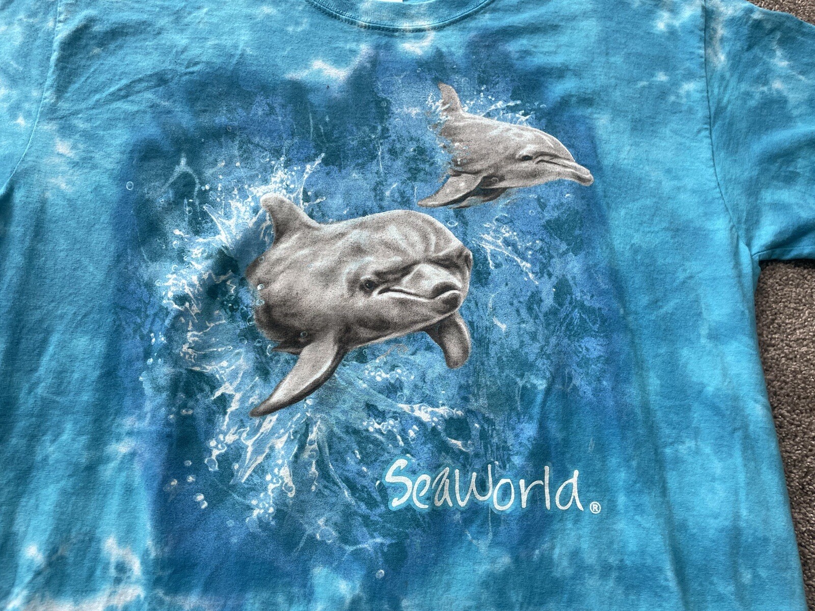 Show off your love for nature and animals with this vintage Anvil Sea World T-shirt. The blue tie-dye pattern adds a retro touch to this classic 80s/90s style shirt. Made from comfortable and easy-care cotton knit fabric, this regular fit shirt features a crew neck and short sleeves, making it perfect for all seasons. The shirt is machine washable and has been pre-shrunk for added convenience. The double-sided design allows you to enjoy the graphics on both sides of the shirt. This shirt is perfect for anyone who loves nature, USA, and animals. Get your hands on this preshrunk, collarless T-shirt today!
