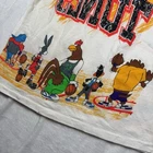 This vintage T-shirt from the 90s is a must-have for any fan of Space Jam and Looney Tunes. Featuring Bugs Bunny and other characters from the iconic movie, this white cotton shirt has a crew neck and short sleeves. The double-sided graphic print makes it a unique piece of merchandise that will stand out in any collection. The shirt is made in the United States and is a regular fit, perfect for all seasons. Its accents and fabric type can be seen in the pics above. This T-shirt is a great addition to any wardrobe and is sure to be a conversation starter.