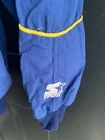 This product is a vintage St. Louis Blues Starter jacket in size M, officially licensed by the National Hockey League (NHL). The jacket features the team's logo and colors, making it a perfect item for any fan of the St. Louis Blues. The vintage design adds a unique touch to this classic piece of fan apparel, which is ideal for men who are looking to show their support for their favorite hockey team in style. Made in the United States, this jacket is a must-have for any passionate fan of the Blues. This also includes the vintage adjustable hat! Message me with any questions!