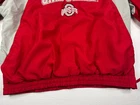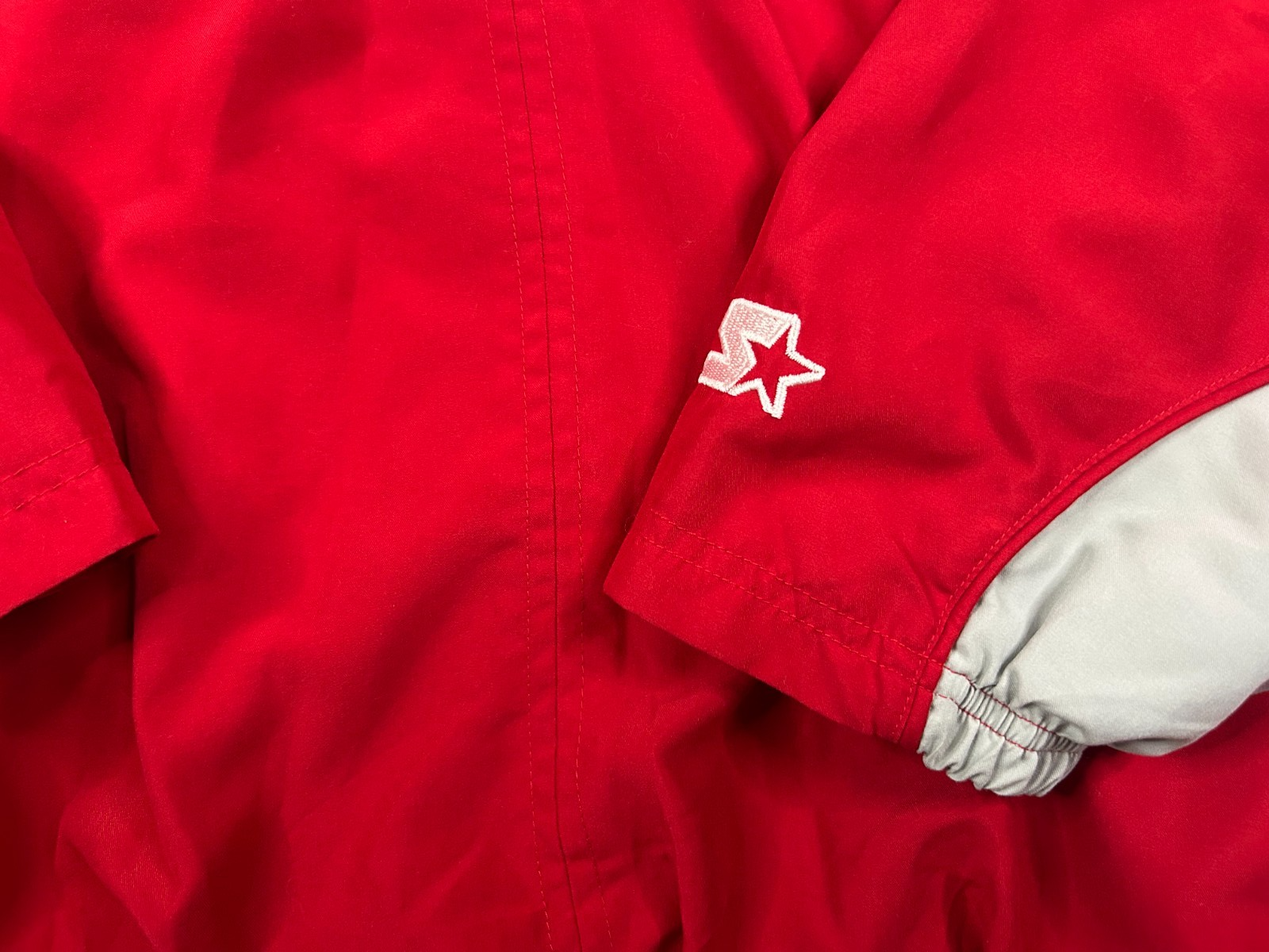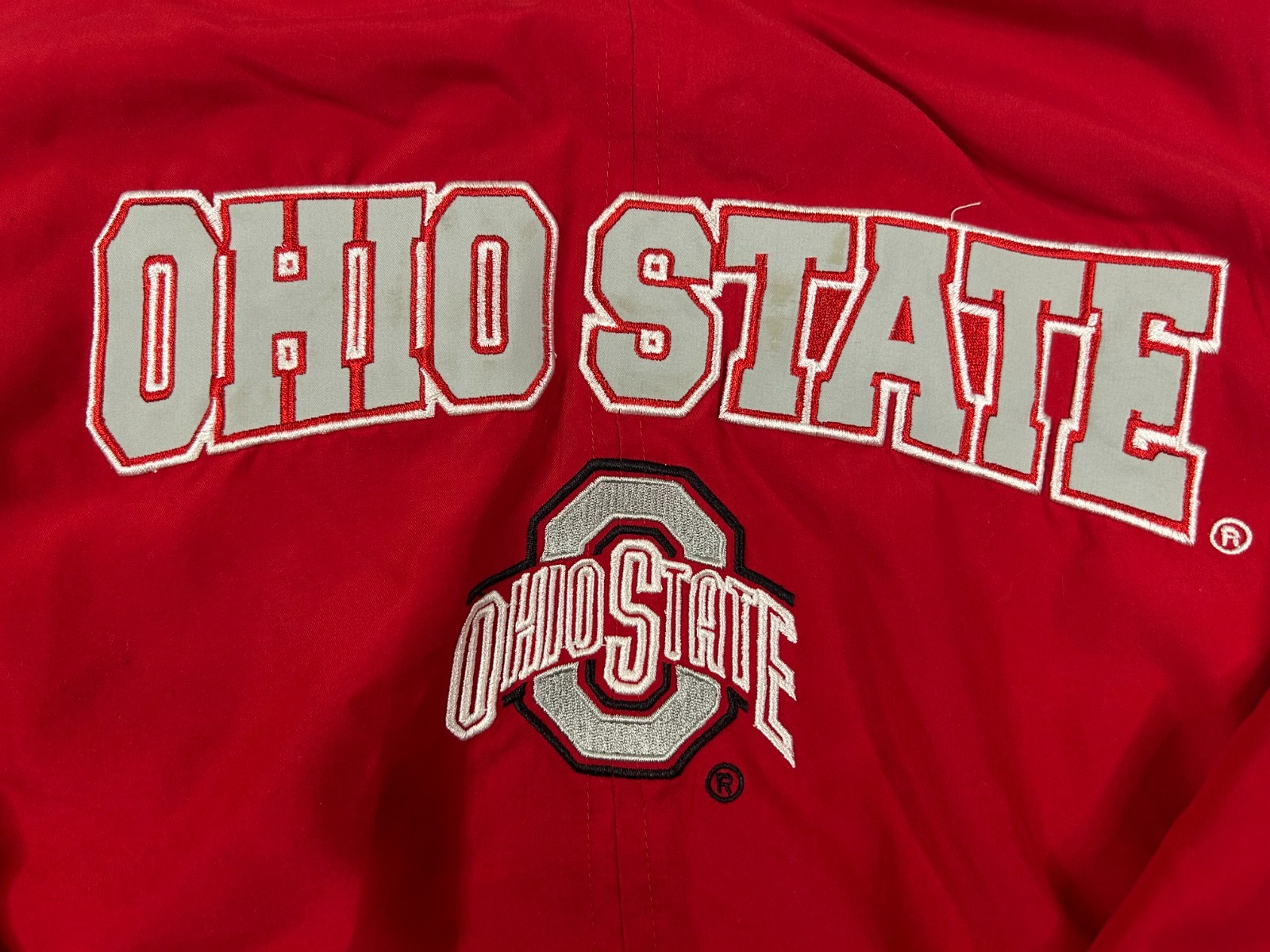 The Vintage 90s Starter Ohio State Buckeyes Windbreaker Pullover in Men's XL is a stylish and nostalgic piece of fan apparel for supporters of the NCAA football team. Made by the iconic brand Starter, this red jacket features the Ohio State Buckeyes team logo and is perfect for representing your favorite team during the regular season. This classic pullover is a must-have for any Buckeyes fan looking to stay warm and show their team spirit in style.