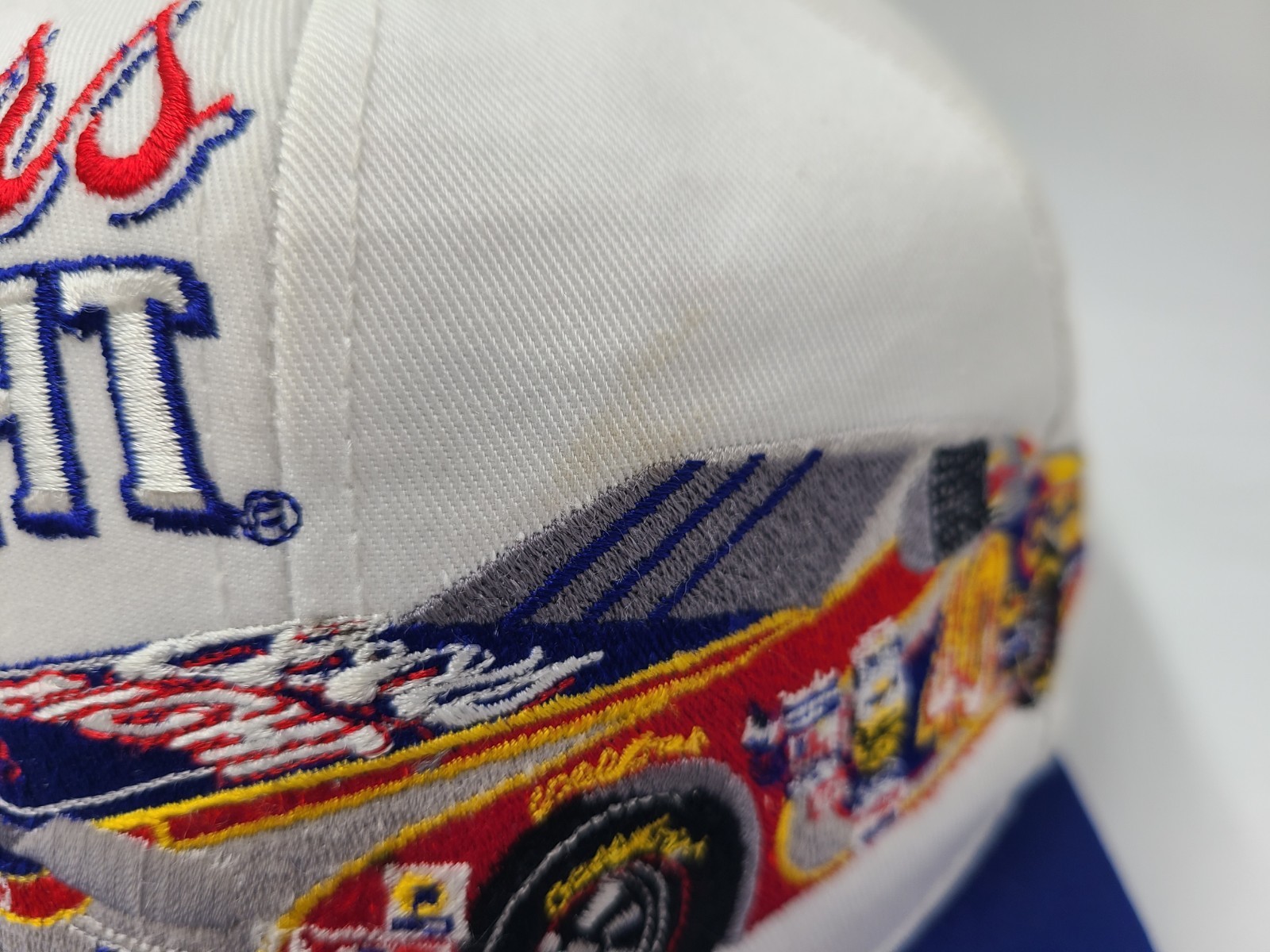 Has stains/discoloration on the front, side, and back as seen in photos. Also has a thread line on the side. Vintage Sterling Marlin #40 Coors Light Snapback Hat Cap 90s NASCAR White Blue. EACH ADDITIONAL HAT PURCHASED IS ONLY $1 ADDED SHIPPING!