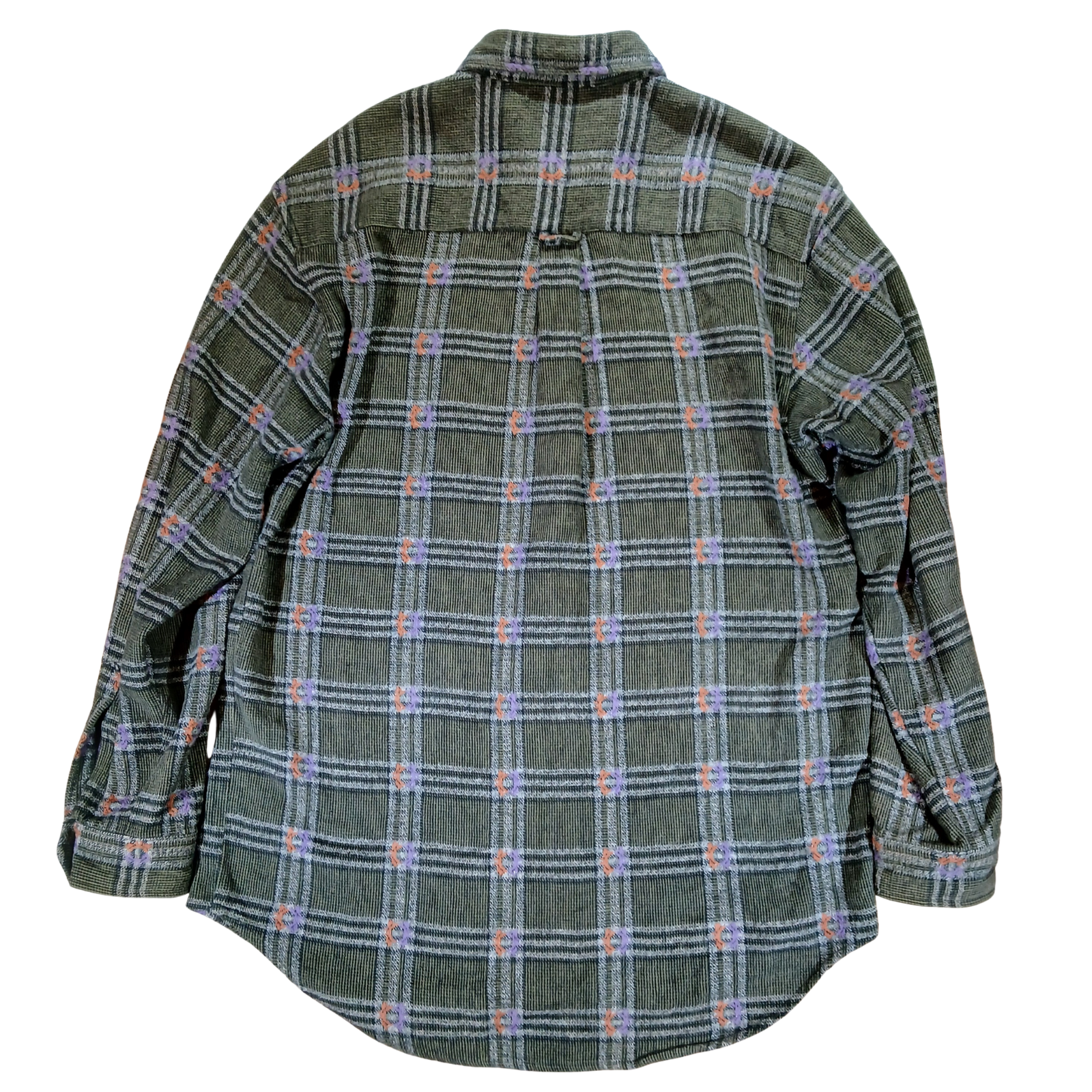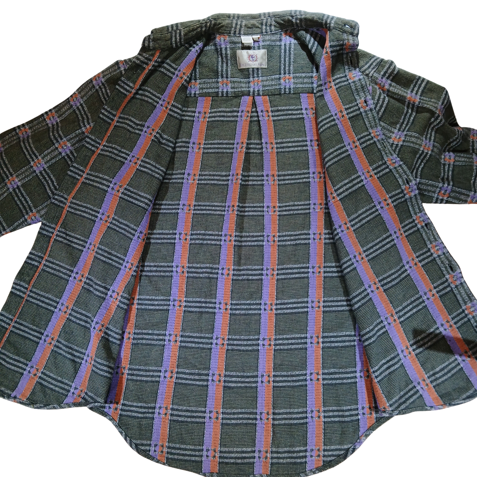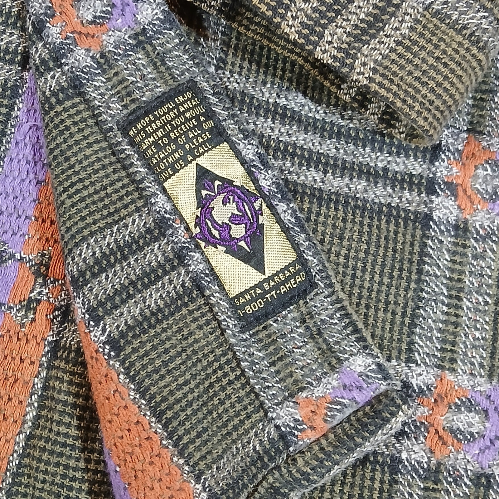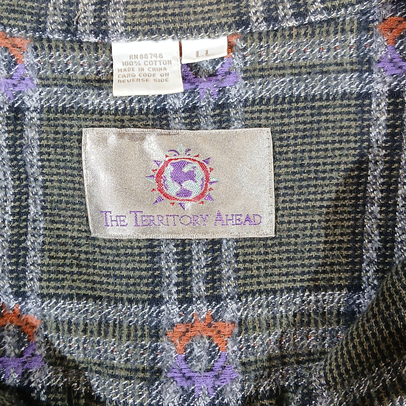 Vintage The Territory Ahead long sleeve button-down shirt featuring a distinctive multi-color plaid pattern with woven geometric accents. Made from 100% cotton with a soft flannel hand and relaxed, comfortable fit. This shirt reflects The Territory Ahead’s 1990s outdoor / Southwestern-inspired design , a period known for bold patterns and quality construction. A great everyday vintage piece that layers well and still has plenty of life left. Details: Brand: The Territory Ahead Era: 1990s (vintage) Material: 100% Cotton Color: Olive green base with purple & rust accents Pattern: Plaid with woven geometric motifs Sleeve: Long sleeve Closure: Button front Size: Men’s Large Long / Tall (see measurements)