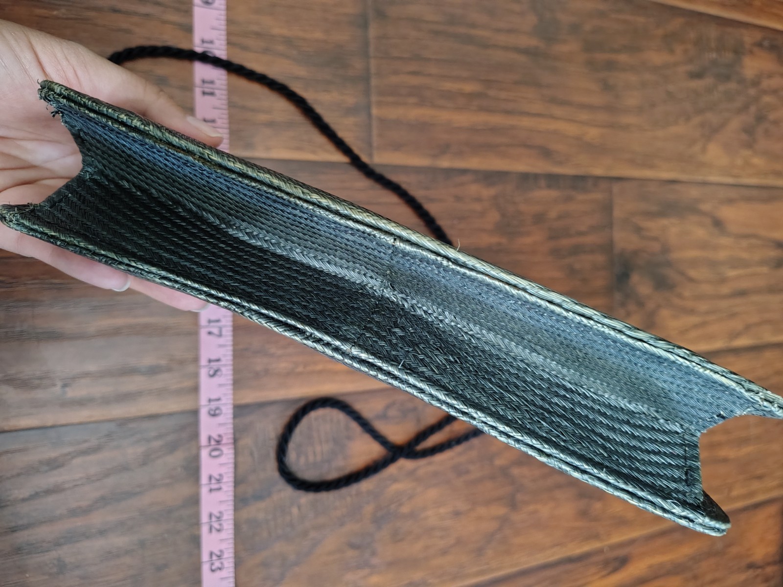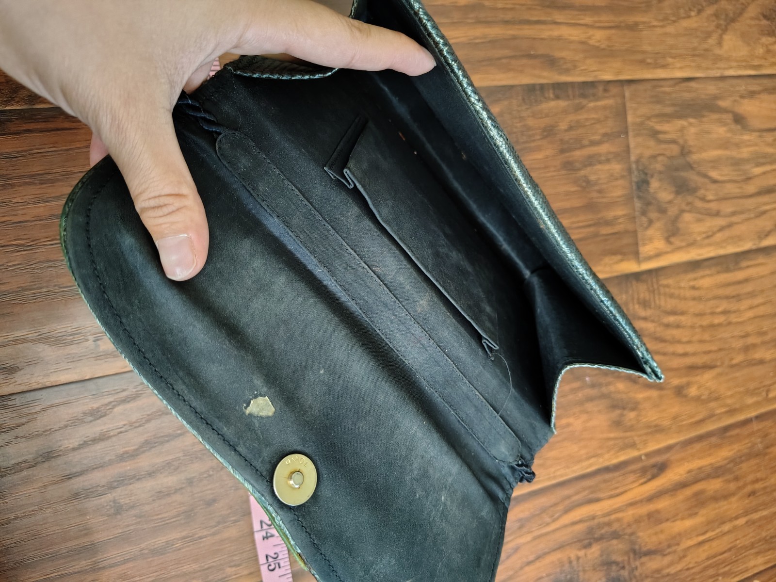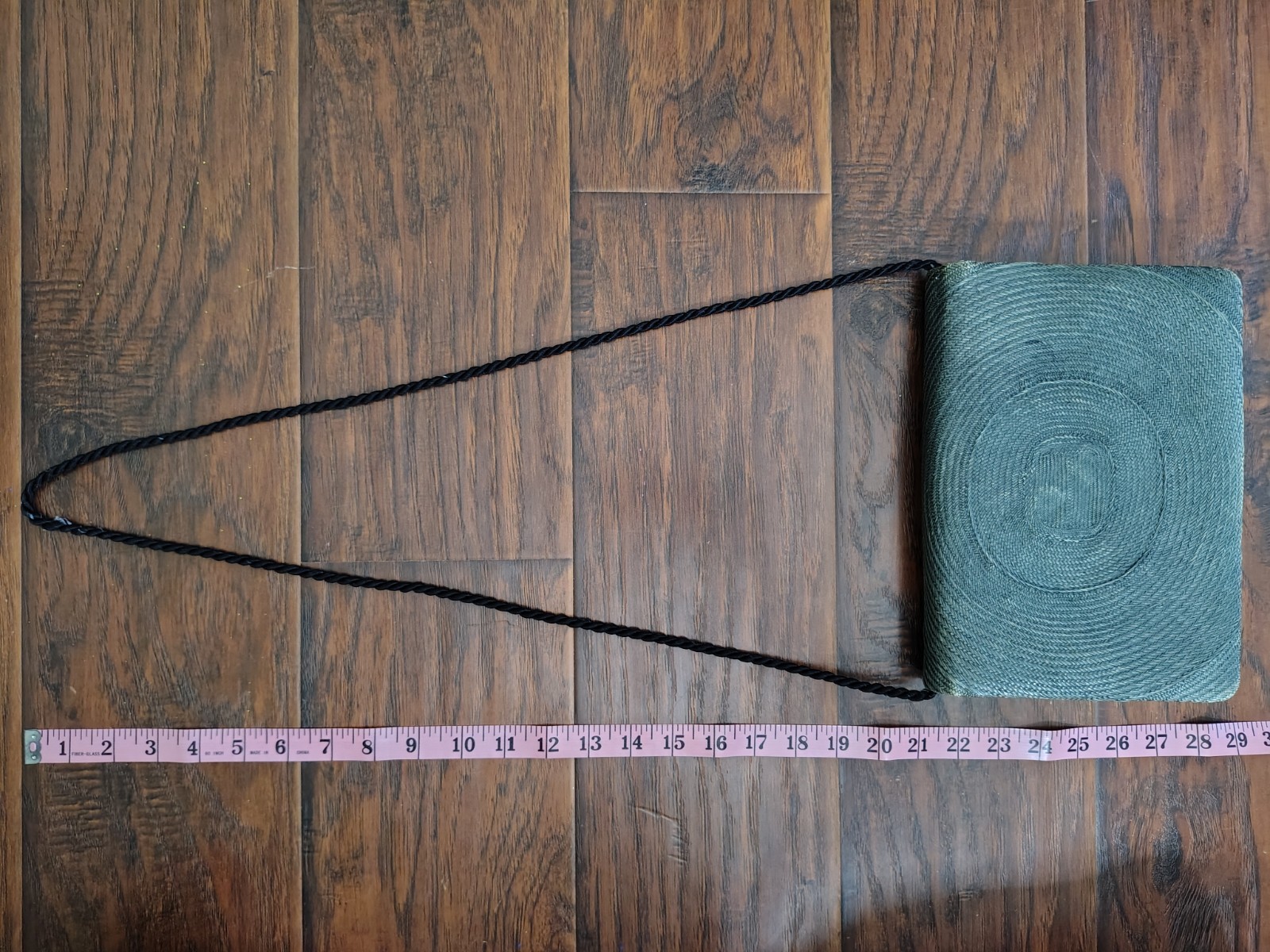 Vintage 90s Tokyo woven green shoulder bag purse. no holes on body of bag, some signs of wear. twisted strap. labeled Tokyo on hardware inside. wooden accent piece on front with flower on it.