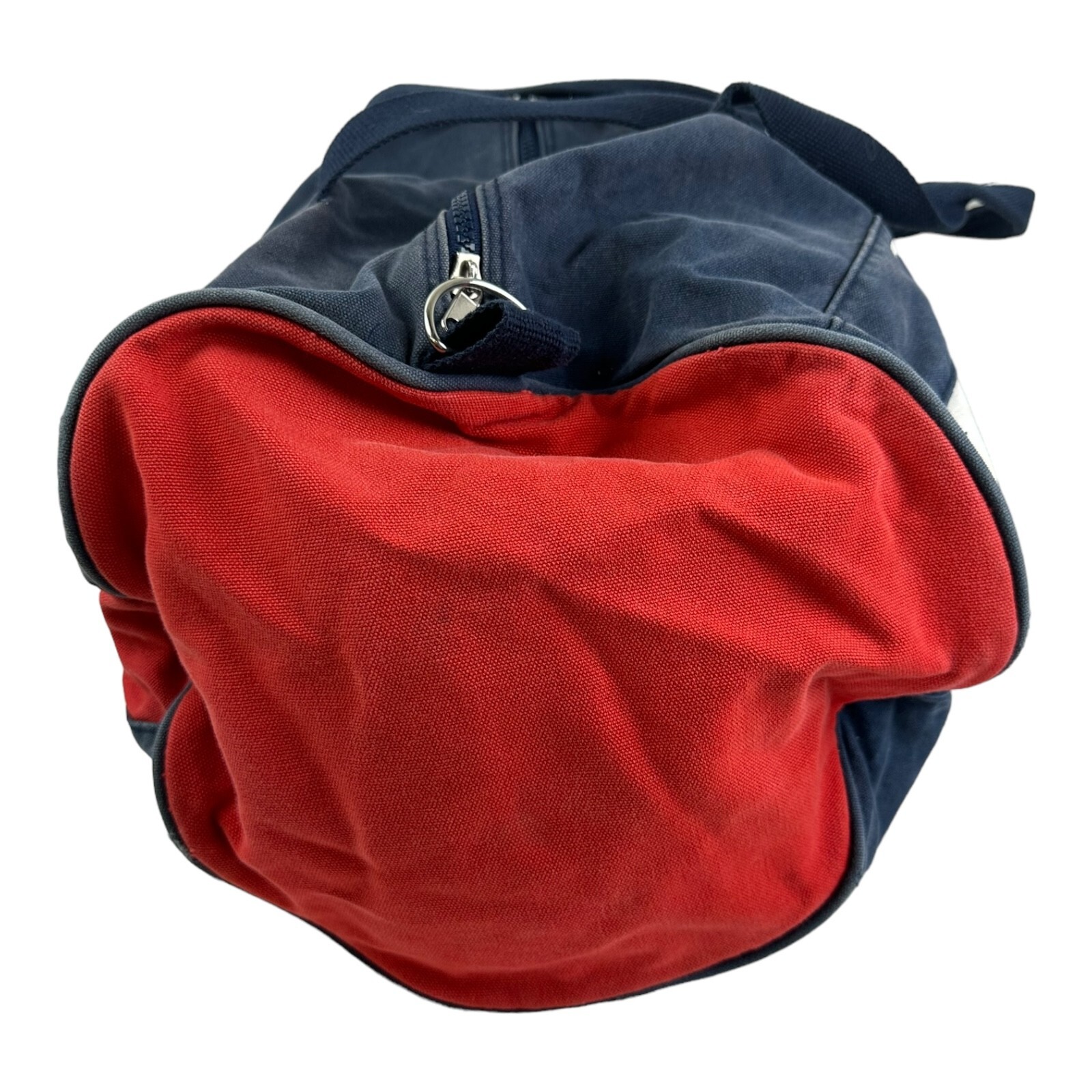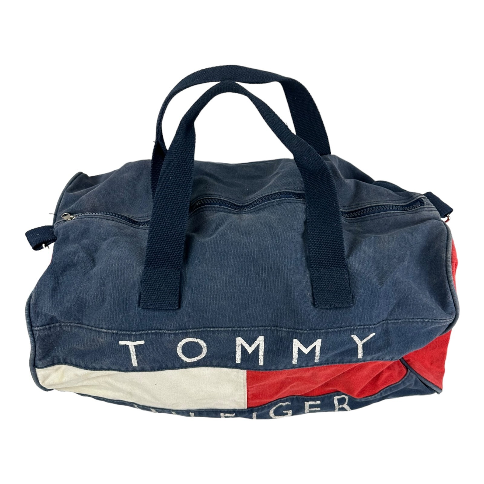 Vintage Tommy Hilfiger Duffle Bag Gym Flag Spell Out Color Block 1990s Red. In good condition, wear and fade as shown. Needs a shoulder strap attachment which you can probably use from another bag. See photos, sold as-is.