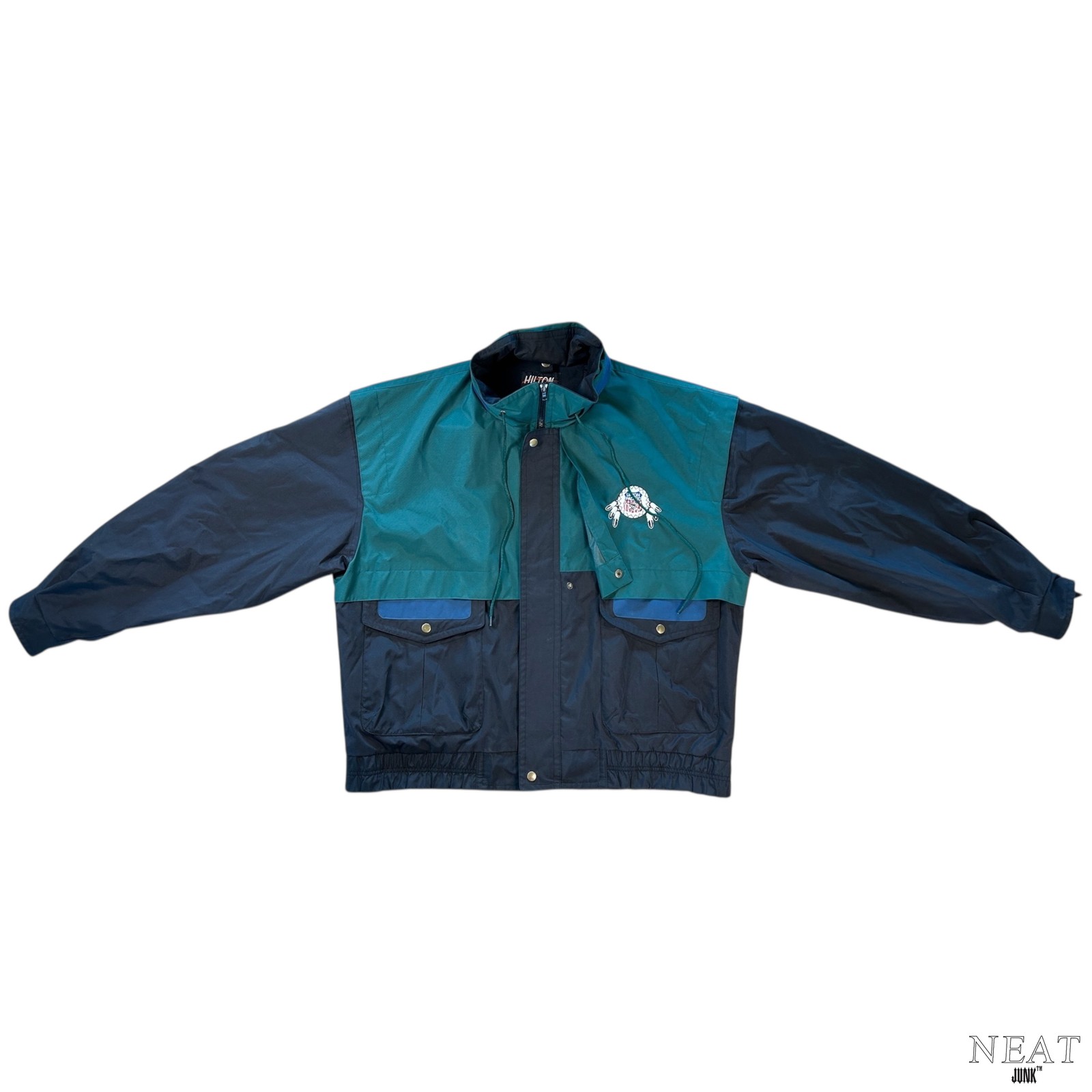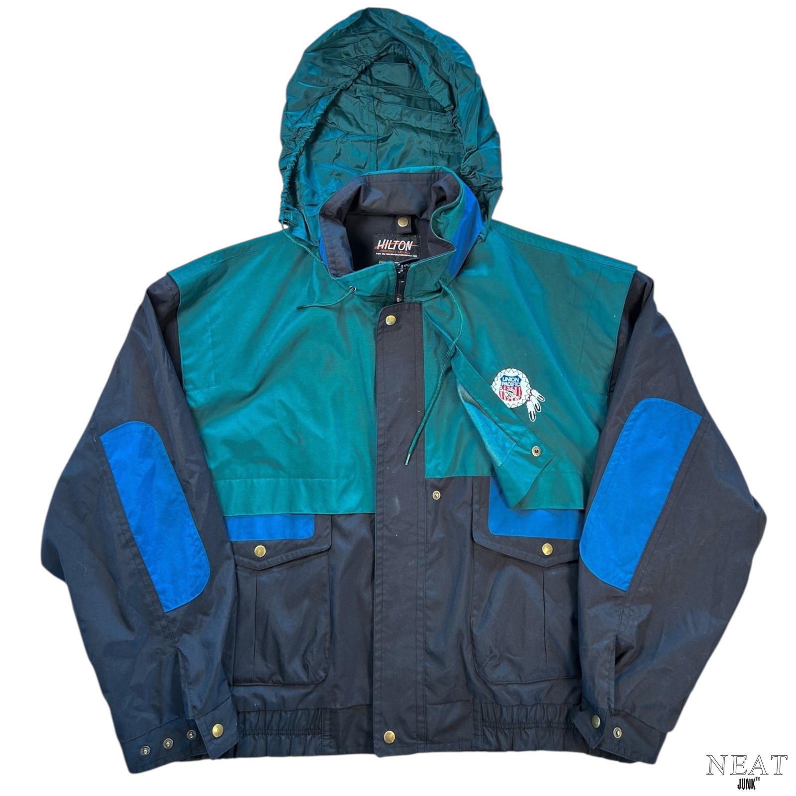 Size: XL pit to pit: 27" Length: 27 3/4" Union Pacific Cherokee Division emroidery on left of chest green and navy paneling packable hood and adjustable sleeves