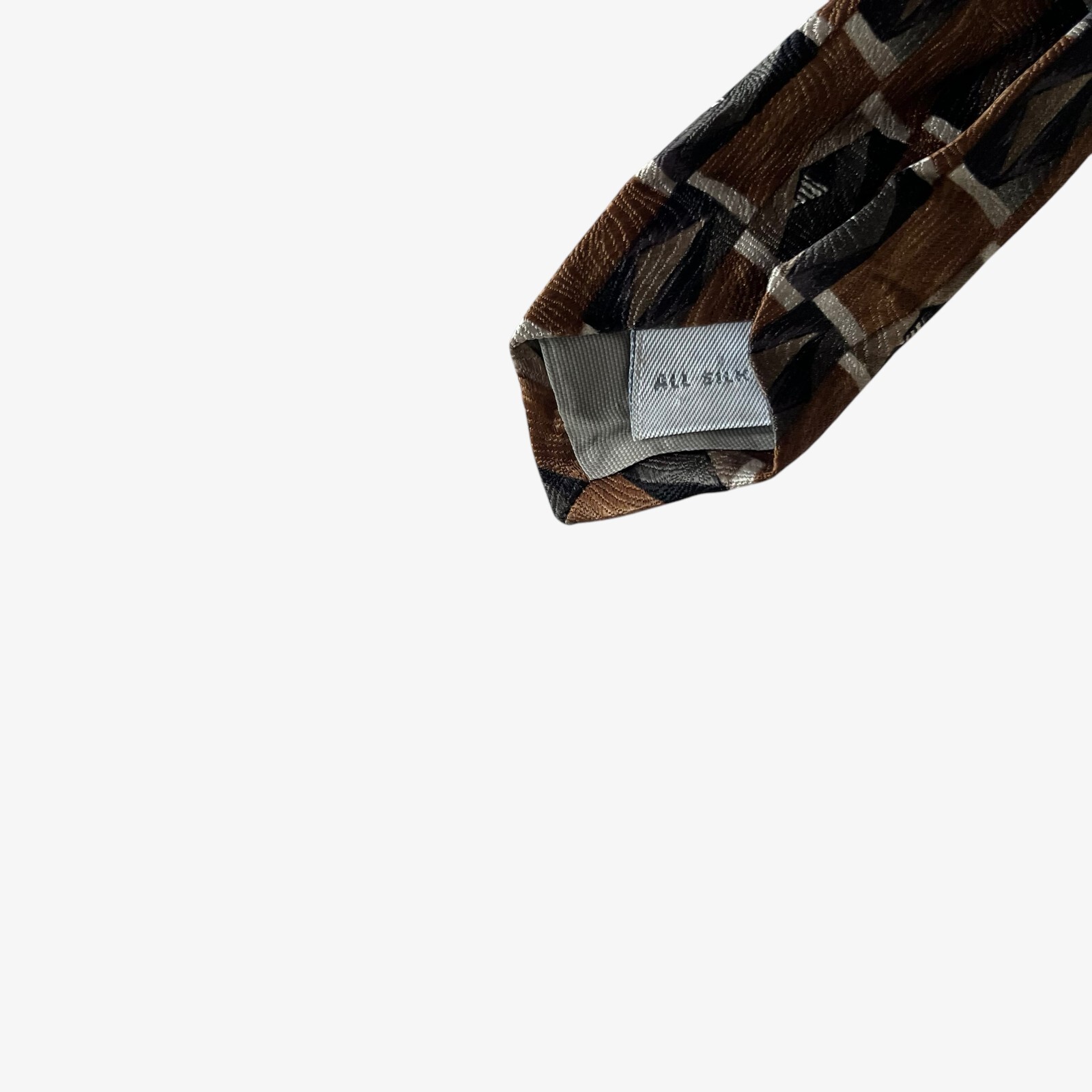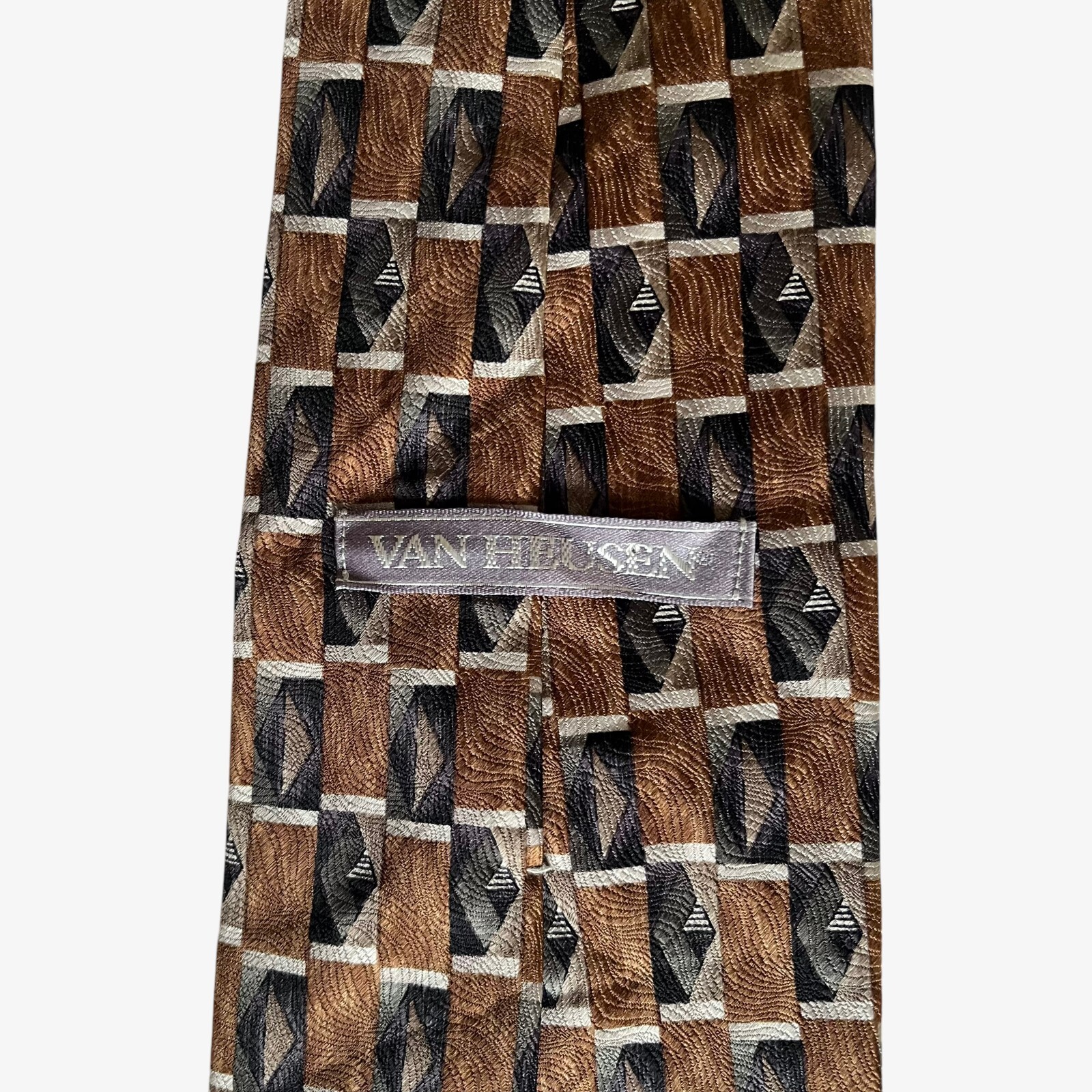 Vintage 90s Van Heusen Geometric Brown & Grey Print Silk Tie Condition: Good. Signs Of Wear Around The Item.