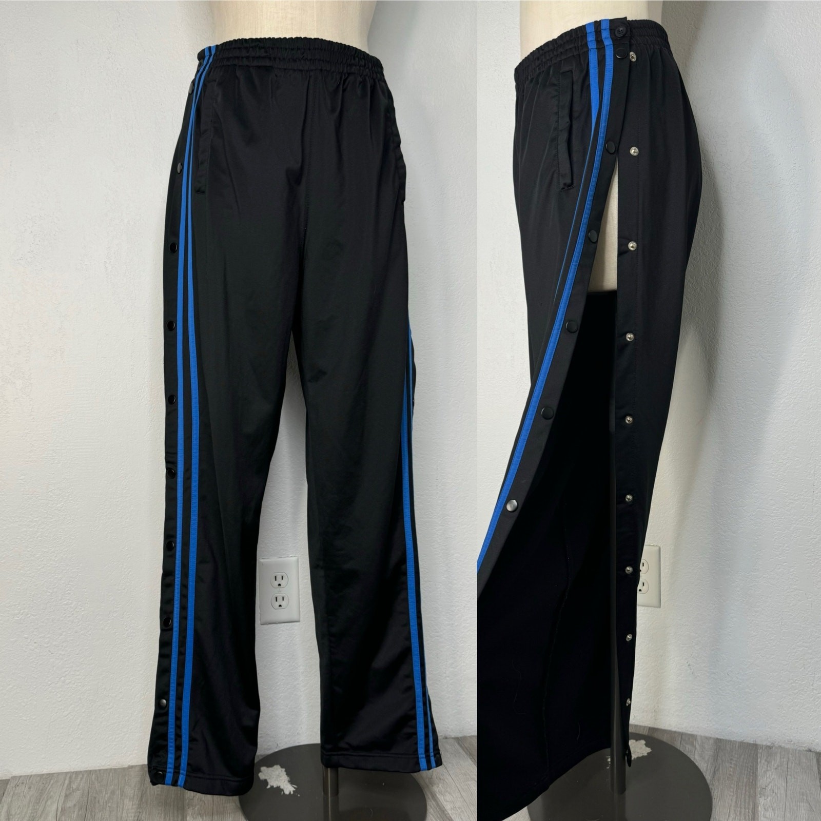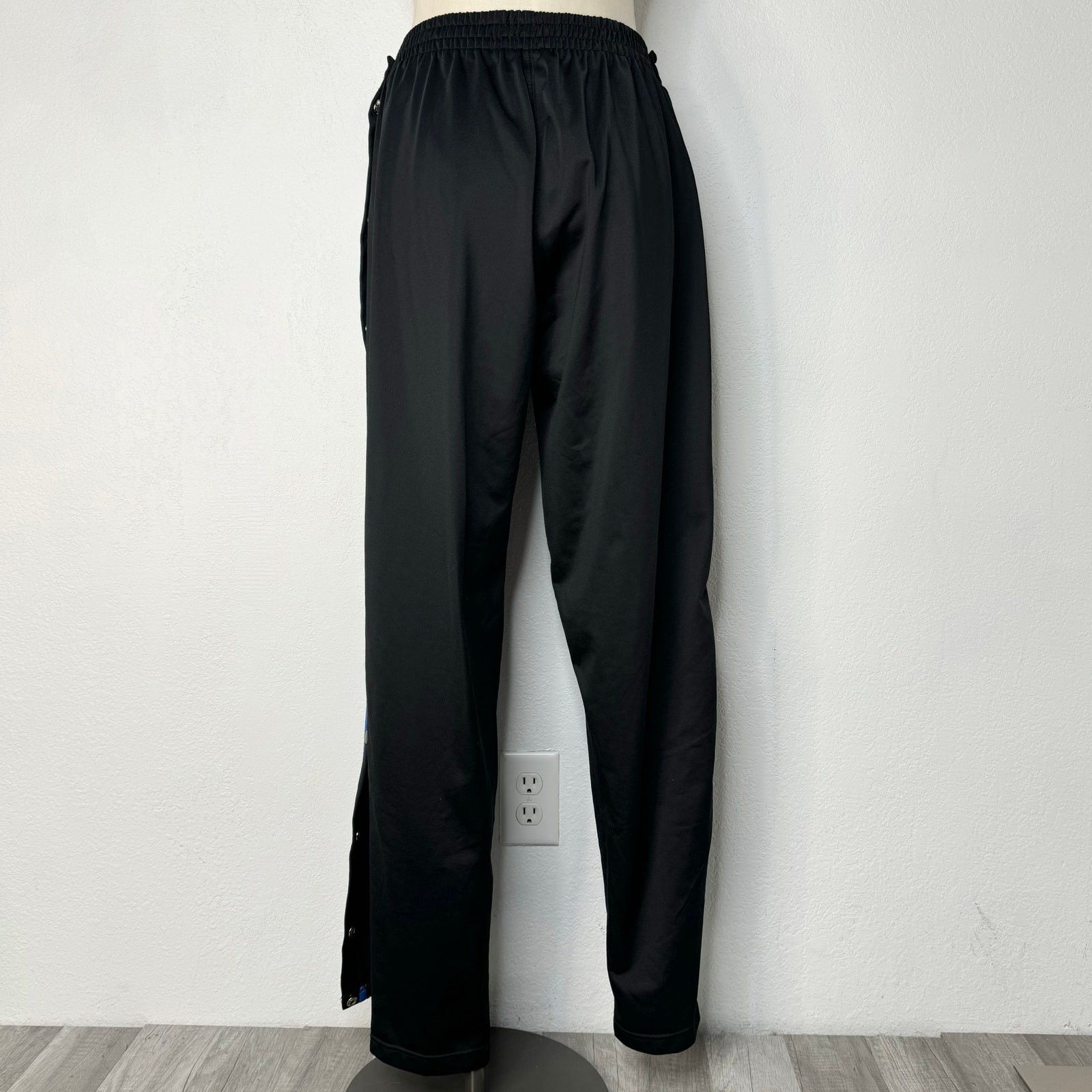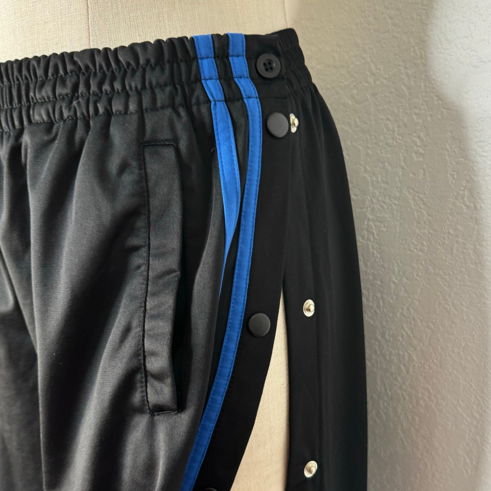 Vintage 90s Y2K Brake Tear Away Track Pants Side Stripe Blue Black Size Large, Steve & Barry’s, a few snags Measurements (approximate): Laying Flat not Doubled Waist: 14 1/2” Rise: 13 1/2” Inseam: 32”