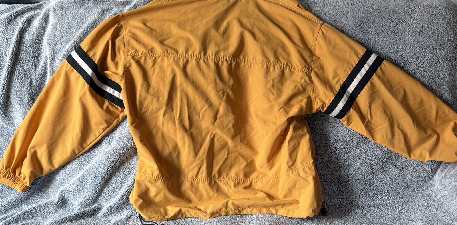 This Vintage 90s Y2K Old Navy Yellow Hood Pullover Nylon Jacket in size L is a stylish and nostalgic piece of men's clothing. The windbreaker style, hooded design, and vibrant yellow color give it a retro feel that is perfect for those looking to add a pop of color to their wardrobe. Made from durable nylon material, this jacket is not only fashionable but also functional for outdoor activities in all weather. Perfect for a casual day out or a fun 90s-inspired outfit.