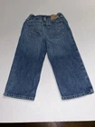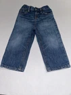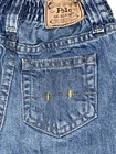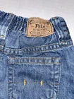 This is a vintage pair of Polo Ralph Lauren denim jeans in toddler size 24 months. The jeans feature a solid blue color, straight leg style, and a combination of zip, button, and snap closures. They are made of 100% cotton and have a fabric type of denim. The jeans are perfect for travel or casual occasions and come with pockets for added convenience. They have a Y2K design that is perfect for vintage baby enthusiasts and are suitable for both summer, fall, and spring seasons. The jeans are unisex and have a classic American theme. They were manufactured in Colombia and are a great addition to any baby's wardrobe. Jeans measure 9" across the elastic waistband and have an inseam of 11.5" long.