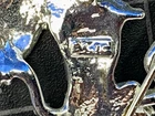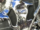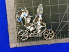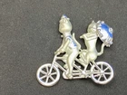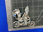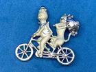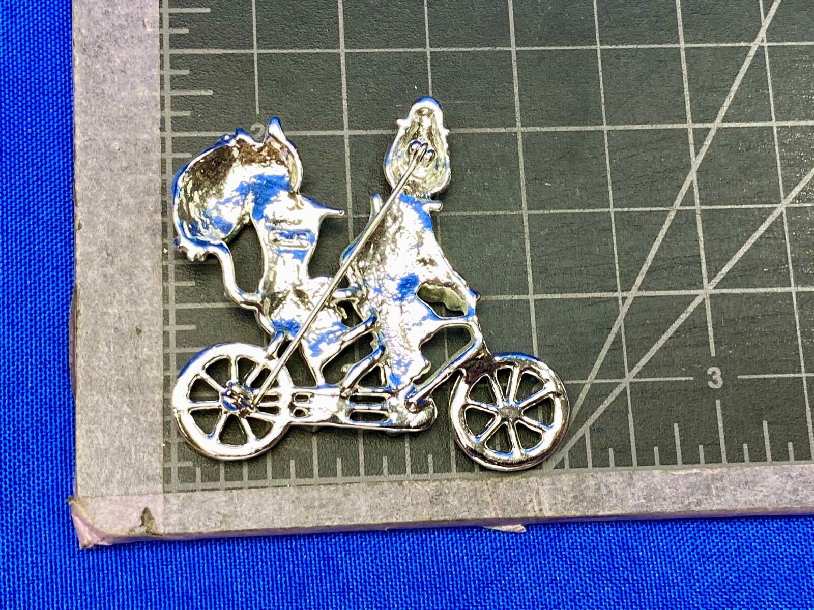 This vintage brooch features a unique design of two cats riding a bicycle with an umbrella. The piece is made of sterling silver and has a silver tone color. The brooch is signed and from the fashion jewelry department. It is a great addition to any vintage or antique jewelry collection and would make a lovely gift for a cat lover. The brooch is in excellent shape and ready to be worn with any outfit.