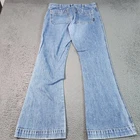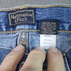 Brand: Abercrombie & Fitch Style: Womens mid-rise flared leg jeans with front and back patch pockets. Color: Blue medium wash denim. Size: Womens 31x30, regular fit. Materials: 100% cotton non-stretch denim; made in U.S.A.; style code AW080 on inner care tag. Design details: Classic waistband with belt loops, full button fly closure with branded buttons, front patch pockets, back patch pockets with Abercrombie & Fitch logo tab, and wide flared leg openings with finished hems. Features: Rigid 100% cotton denim construction for a vintage look and feel, medium wash finish with natural fading, versatile casual style that pairs well with tees, tanks, or sweaters, and made-in-USA quality from Abercrombie & Fitch. Flaws: Pre-owned jeans with light overall wear and wash fading from normal use; denim, seams, hems, and pockets are clean and intact with no stains, holes, or fraying; button fly and belt loops are secure.