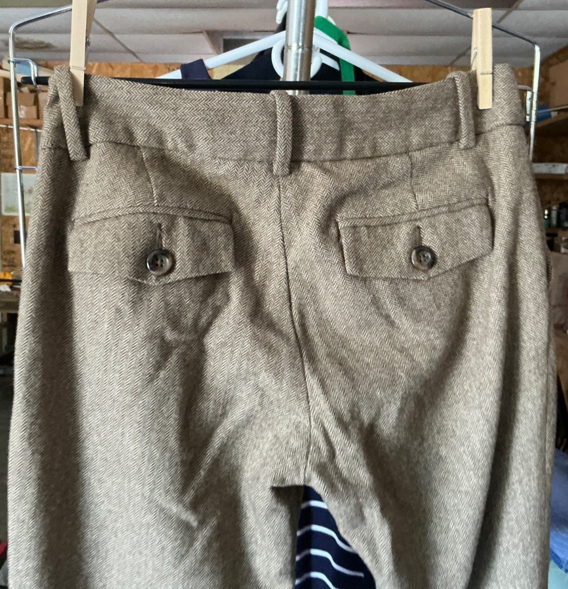 Abercrombie and fitch tweed pants. In excellent condition because they were never worn. The button is loose on the top pant but I would rather someone who can sew to tighten that up instead of me! Over 23 years old…I bought these at the colonie center mall Abercrombie and fitch outlet in 2003… and we often had much stock from the 90s, but I believe these are about yr 2000. They are lined down to the bottom of the knee with a deep red polyester fabric. Size 2.
