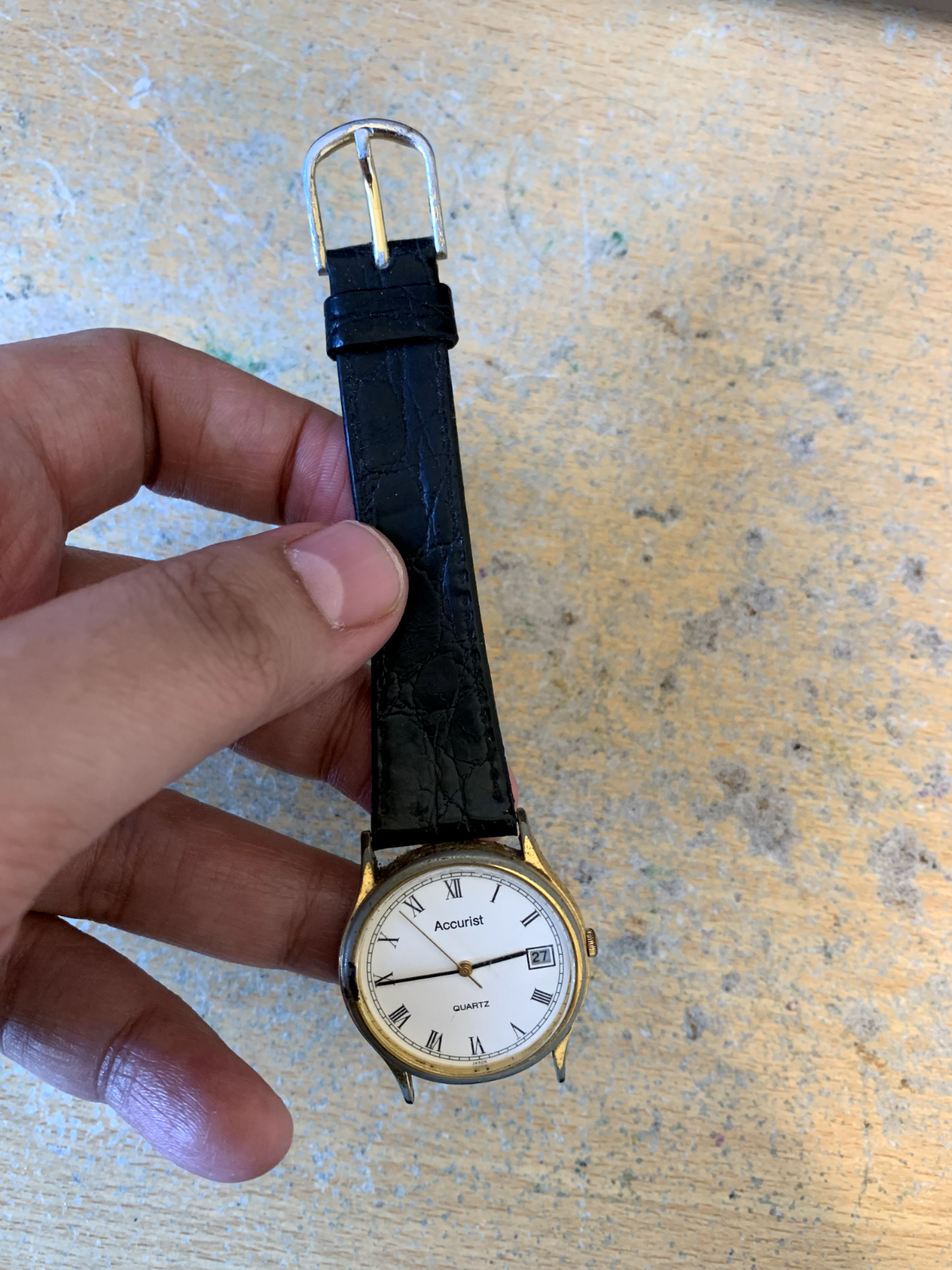 The Vintage Accurist Manual Date Men's Watch is a classic timepiece with a gold case, white dial, and baton indexes. Featuring a mechanical (manual) movement with 21 jewels, this Swiss-made wristwatch also boasts a date indicator, waterproof stainless steel back, and a 12-hour dial. With a round shape and analogue display, this watch is perfect for men who appreciate traditional craftsmanship and timeless style. Fast UK shipping ensures you can enjoy this elegant piece quickly and hassle-free.
